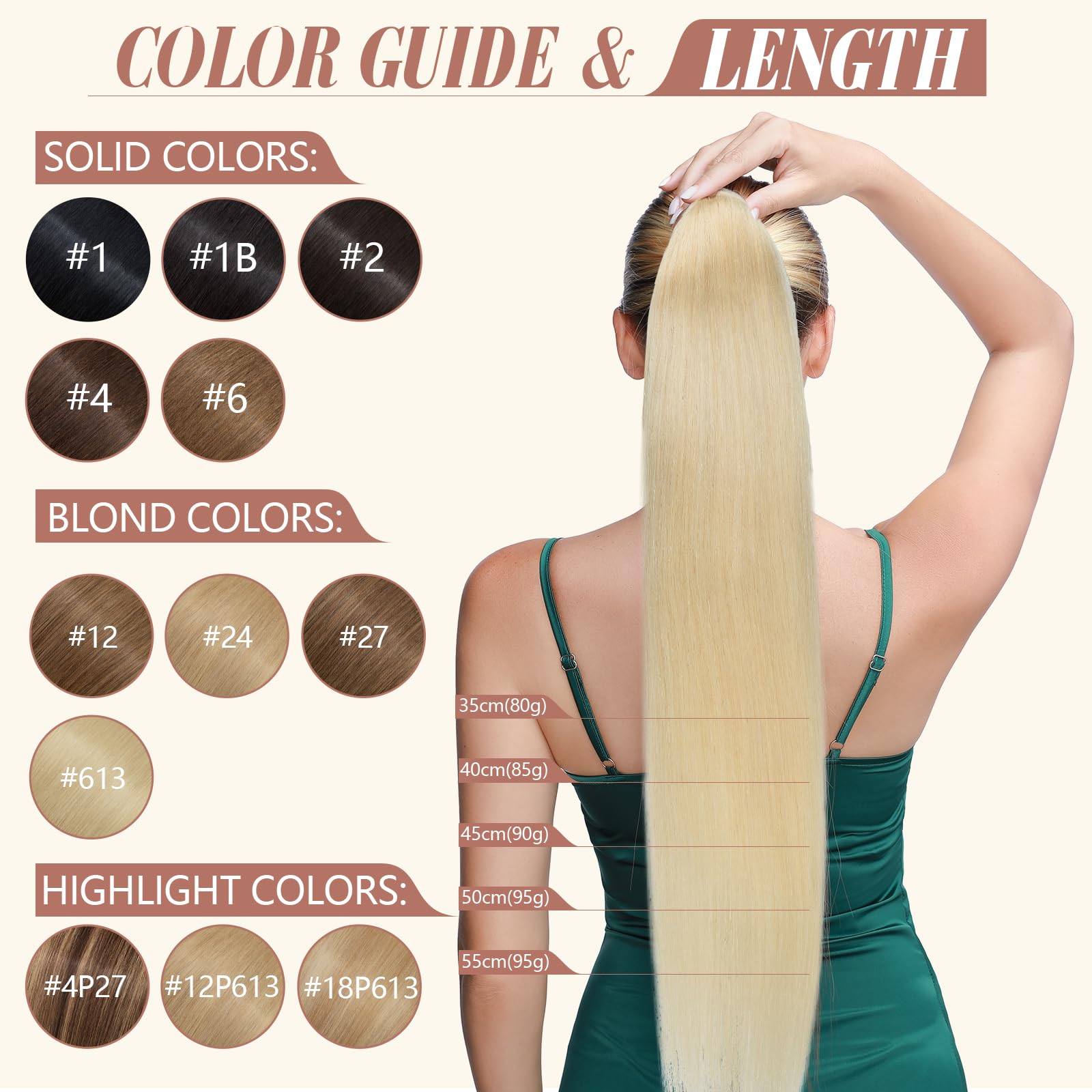 ["100% real hair: These ponytail extensions are professionally treated, soft, shiny, and not rough at all, allowing you to cut, dye, curl, straighten, wash, and comb them just like your own hair.","Long-lasting use: These real hair extensions, selected for the best hair texture, last longer and are easy to care for, ready for washing and blow-drying. Can be used permanently with appropriate hair care.","Easy to wear: With the velcro closure and small clip on the ponytail, you can wear it in seconds. The ponytail is very stable to wear. Even when you are doing sports, the ponytail won't fall off.","For everyday & party: This real hair ponytail looks as natural as your own hair! Very suitable for daily life and various activities. You can also braid it or add your favorite bows, hairpins, and other decorations.","Quality assurance: We are responsible for product quality and customer experience. If you have any questions about color selection, feel free to send us an email. We will solve all problems for you."]
