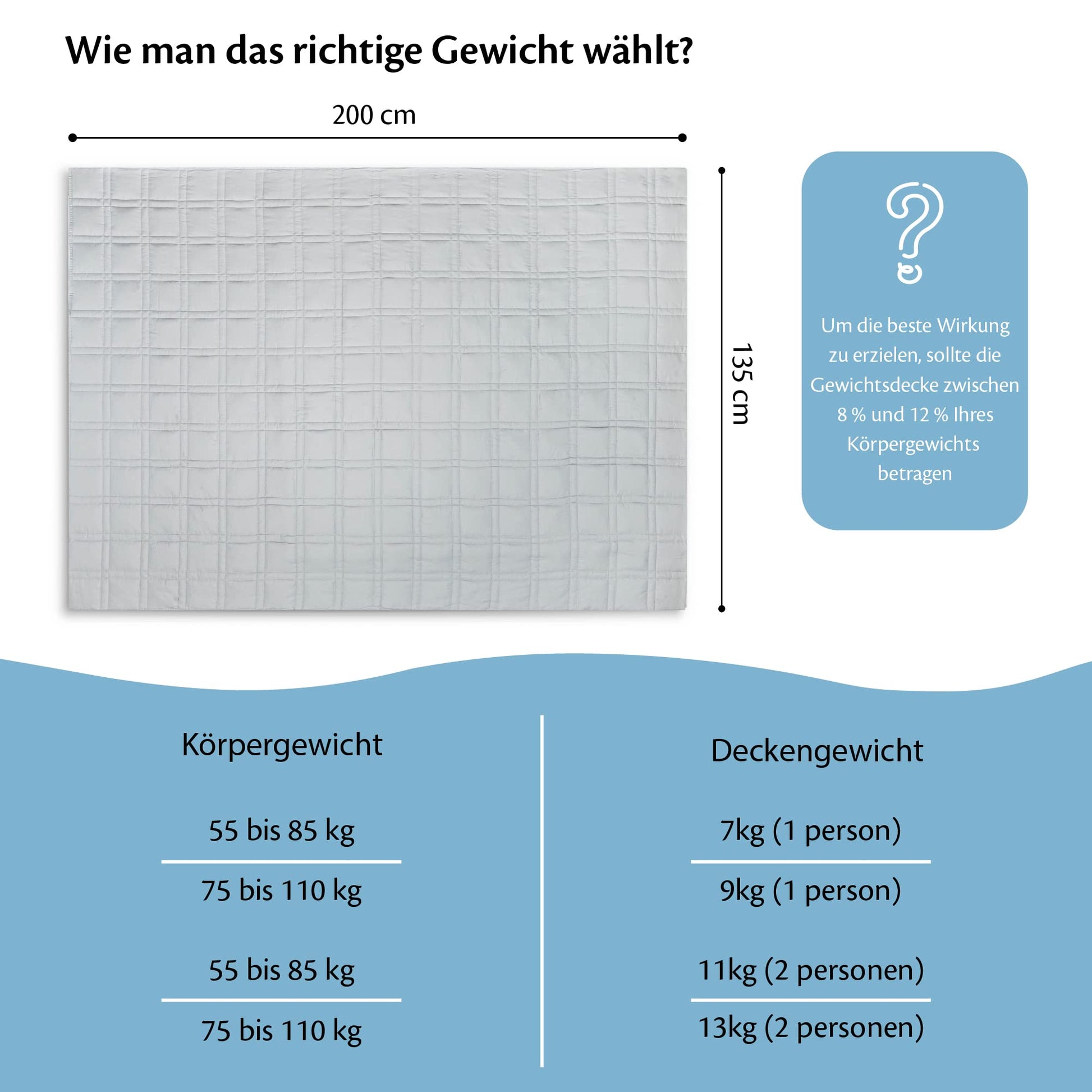 ["DEEP RELAXATION - The Ella Weighted Blanket provides you with the peace you've always been looking for. The weight and pressure of the blanket gently calms your body, relaxes, and reduces stress and anxiety. Sleep deeply and wake up refreshed.","STURDY AND DURABLE - With a durable 7-layer structure, OEKO-TEX certified fabric, and hypoallergenic glass beads, our weighted blanket ensures the ultimate and safe sleeping experience.","VARIETY AND COMFORT - Find your perfect fit! Choose from our extensive range of sizes, designed for optimal comfort. Weights and sizes that perfectly suit your needs. Say goodbye to restless nights and find your personal sleep partner. Scroll down to find out which size fits you.","INDULGE IN COZINESS - This heavy blanket is not only suitable for sleeping - it's your cuddle buddy for everywhere, giving you the feeling of being cuddled all the time. Experience what deep pressure stimulation can do for your restlessness during the day and night.","30-DAY RISK-FREE TRIAL PERIOD - Experience sleep like never before! We offer you a 30-day trial period to ensure your satisfaction. If you're not satisfied, we'll refund your money, no questions asked. Secure your sleep paradise! Add to cart now."]