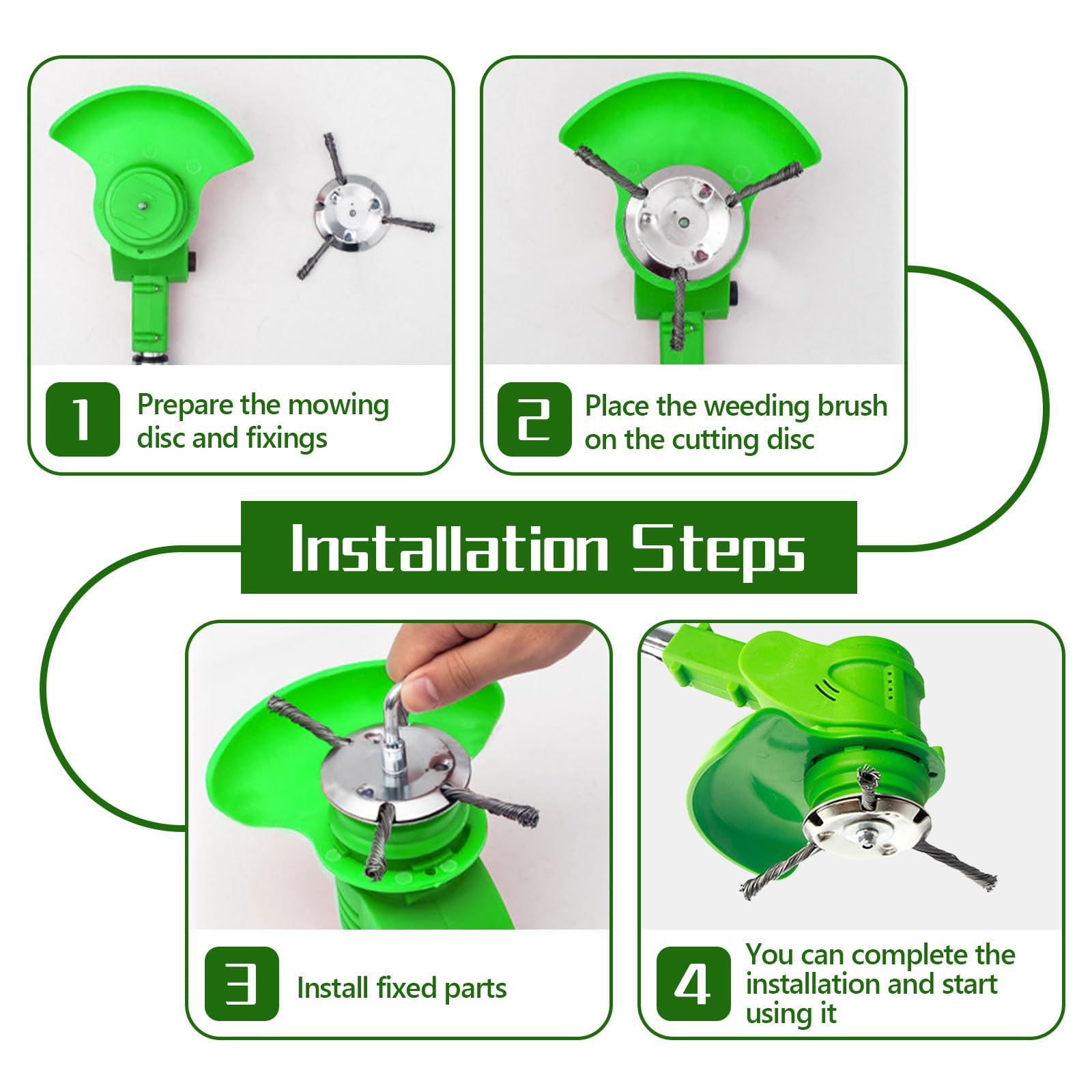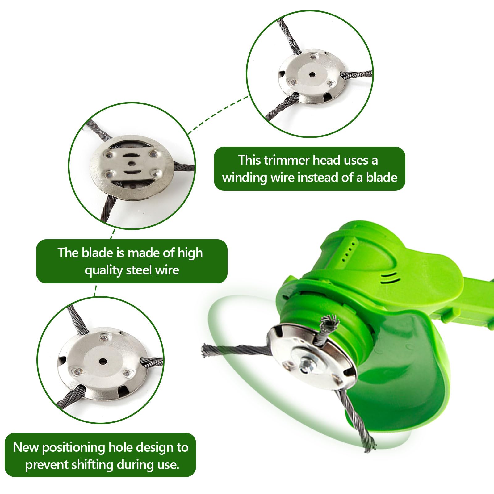 ["High-quality Material: The blade is made of high-quality steel wire, using wound wire instead of a blade for good hardness and durability. The sharp blades improve work efficiency. The sharp blade meets your mowing requirements.", "Efficient Design: The trimmer head uses wound wire instead of a blade, which is flexible, sharp, and efficient. Less weight, less strain on the trimmer, sharp and efficient, effectively removes all moss and weeds from the lawn.", "Versatile Applications: The wire grass trimmer head can be used as a cleaning and polishing accessory, suitable for gardens, lawns, courtyards, parking lots, sidewalks, and more. Suitable for a variety of trimmer models.", "Durable: To grow deep, it provides smooth performance and flexibility with flex lines, extra hardness, and durability. The trimmer head is indestructible and can still work normally on rocks.", "【Easy to Use】 Provide convenient replacement parts for your trimmer that are easy to install and use. The new positioning hole design has been added to prevent the wire from shifting during use."]
