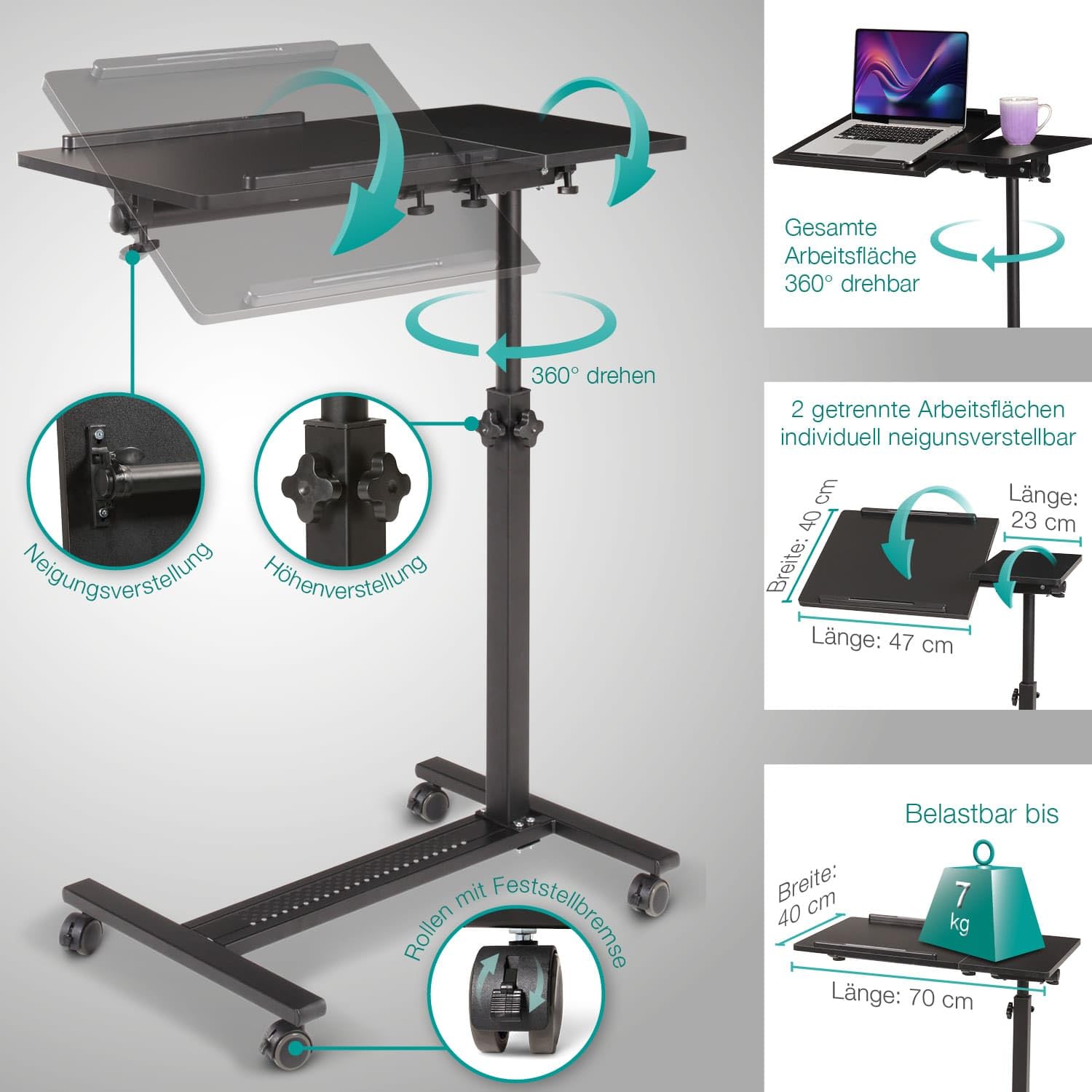 "Ideal for living or bedroom: This side table provides a practical work surface and storage space for drinks, snacks, and writing utensils in both the bedroom and living room.","Adjustable work surfaces: The work surfaces can be independently tilted, providing the ideal setting for books, magazines, laptops, tablets, and more.","With 4 wheels: Equipped with four lockable wheels, this side table becomes a practical piece of furniture that can be used as a bedside table in the bedroom for a comfortable breakfast in bed.","Anti-slip edge: The larger work surface is equipped with an anti-slip edge to prevent books or computers from slipping off and to provide a secure grip in the tilted position.","Sturdy and durable: A sturdy metal frame and robust adjustment screws ensure safe and reliable transportation and use of the side table, making it a practical all-rounder for any room."