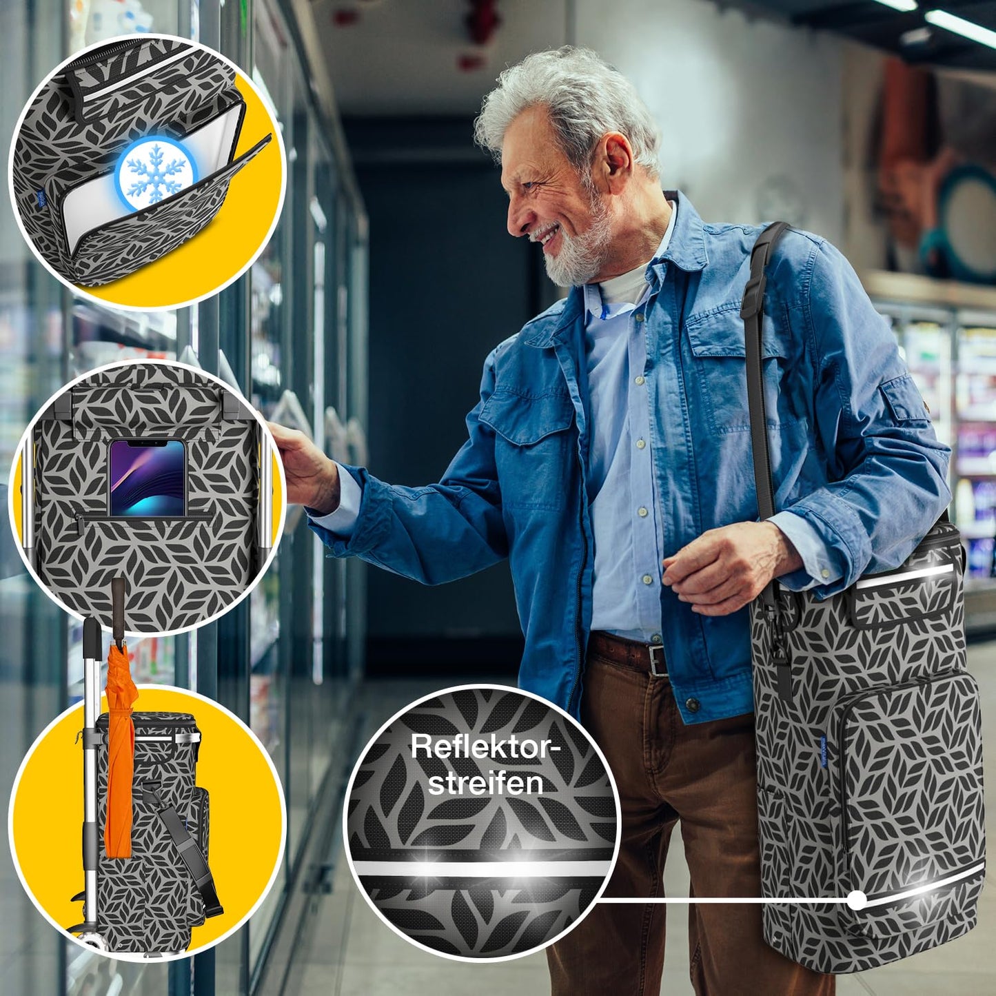 Large storage space: The sturdy shopping trolley with removable bag offers plenty of storage space in its 43-liter main compartment. An extra thermally insulated front compartment with cooling function holds additional contents.
