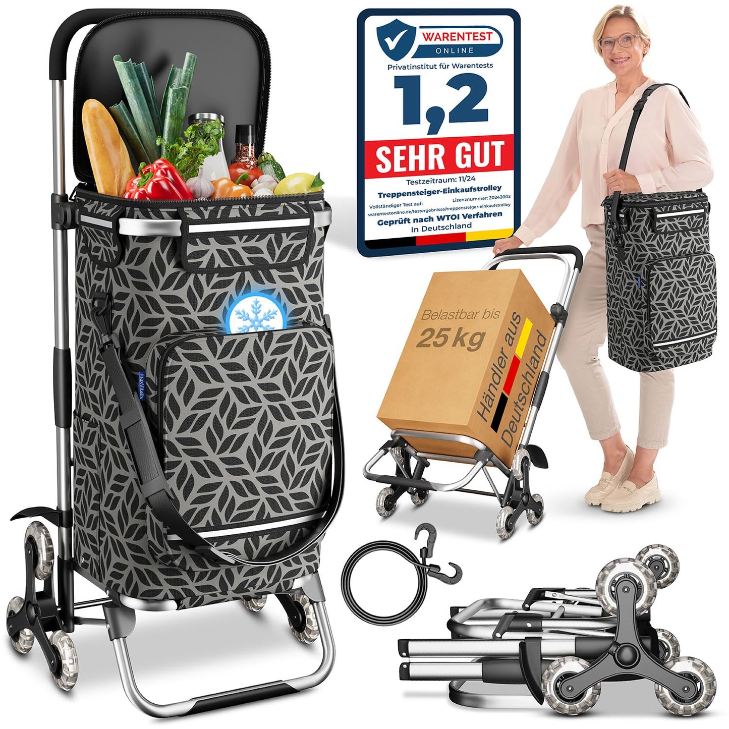 "Makes light work of all levels: Whether it's stairs or curbs, thanks to the 3+3 wheel system, the shopping trolley stair climber tackles all obstacles.