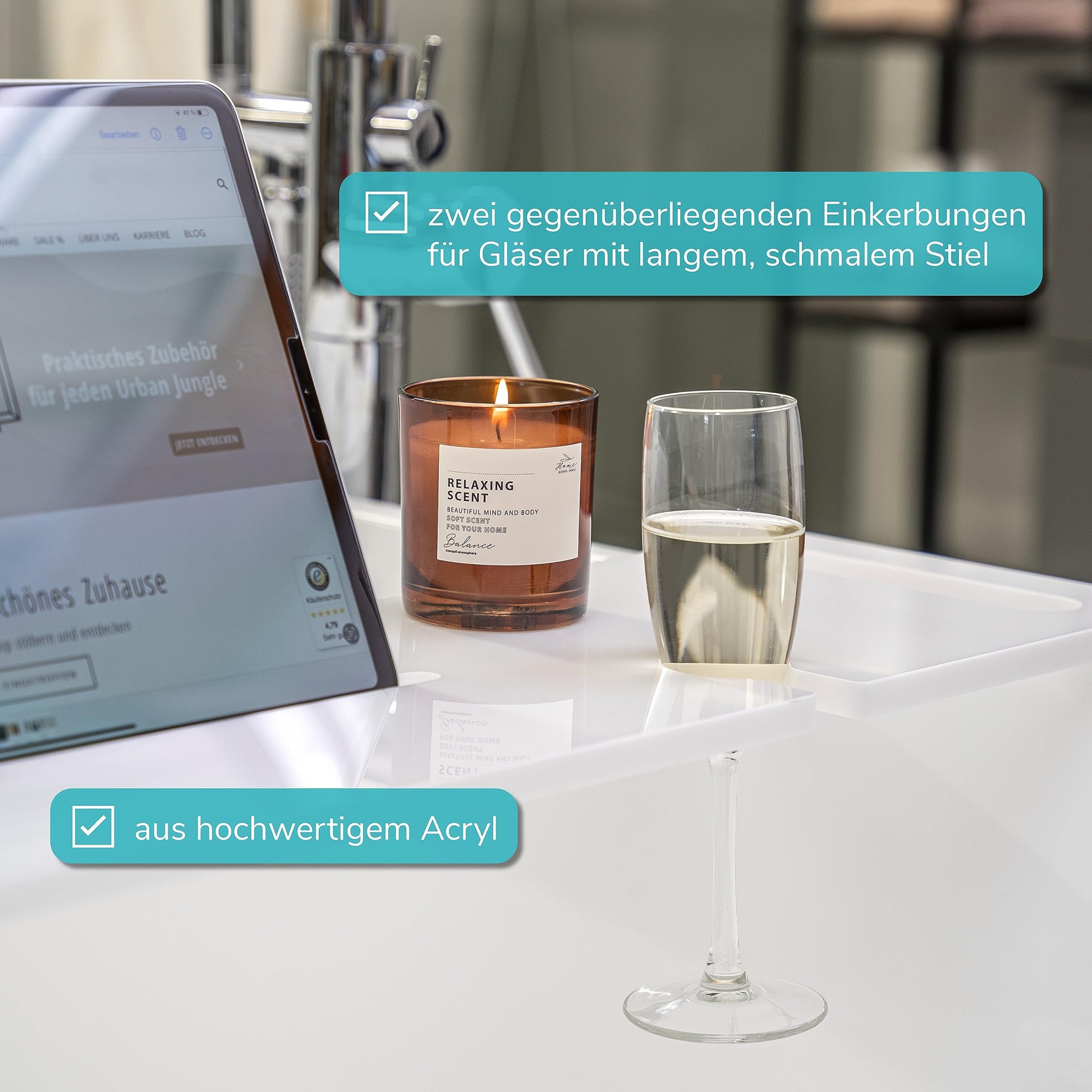 ["You will receive a bathtub tray, which is perfect for any bathtub. Whether freestanding, attached to the wall, or even a corner tub, the tray always looks high-quality. The board itself is easily stored and can be cleaned with ease.","The tray has a groove of approximately 1 cm deep where you can place your e-book reader, phone, or tablet. It is approximately 30.5 cm long.","Two opposing notches for glassware with narrow stems complete the concept. The two side handles can be used during use for smaller towels or washcloths. Anti-slip pads ensure a secure fit. This makes bathing even more enjoyable, possibly even for two people.","Made of high-quality acrylic and anti-slip pads","Approximately 35.4 x 0.5 x 7.9 inches (W/H/D)"]