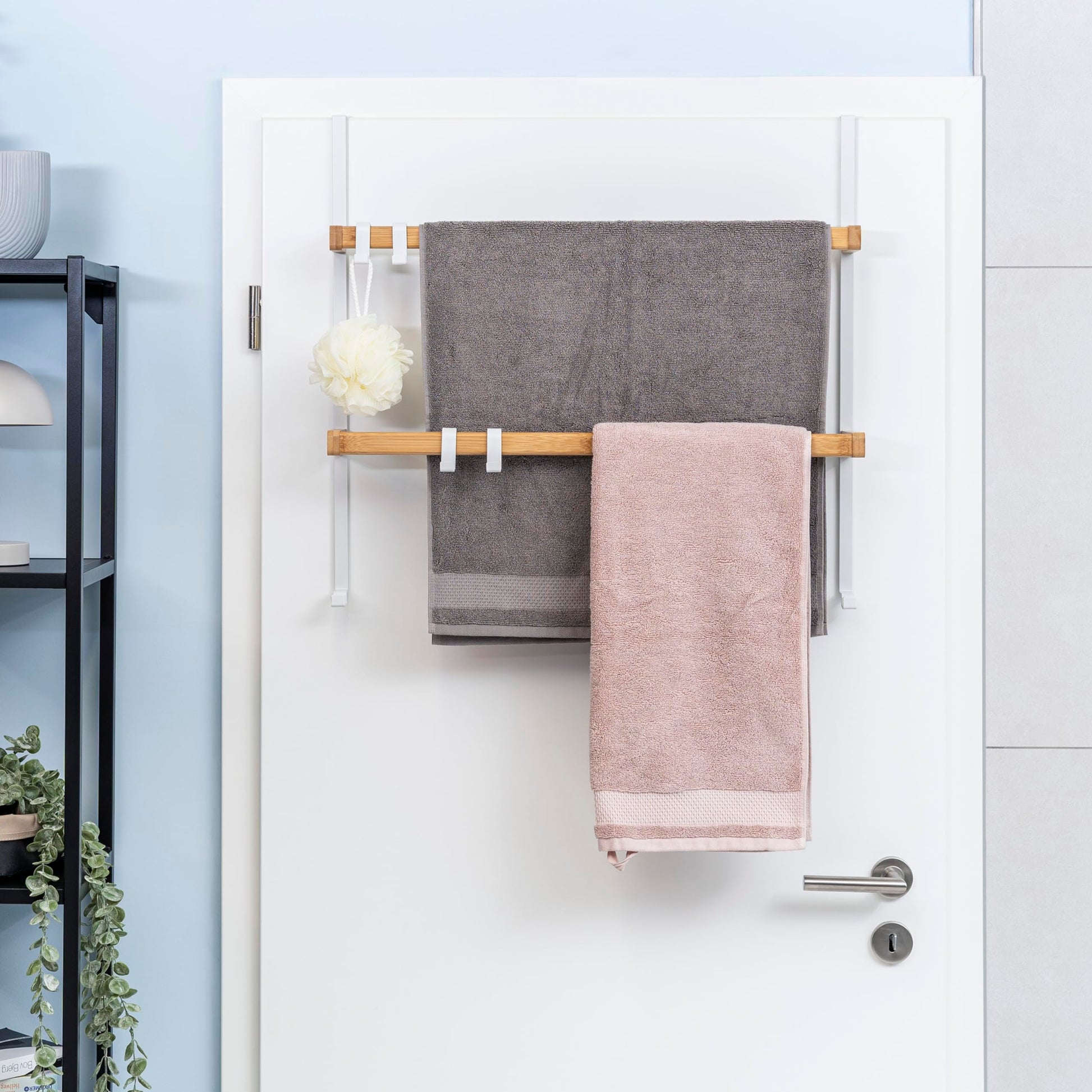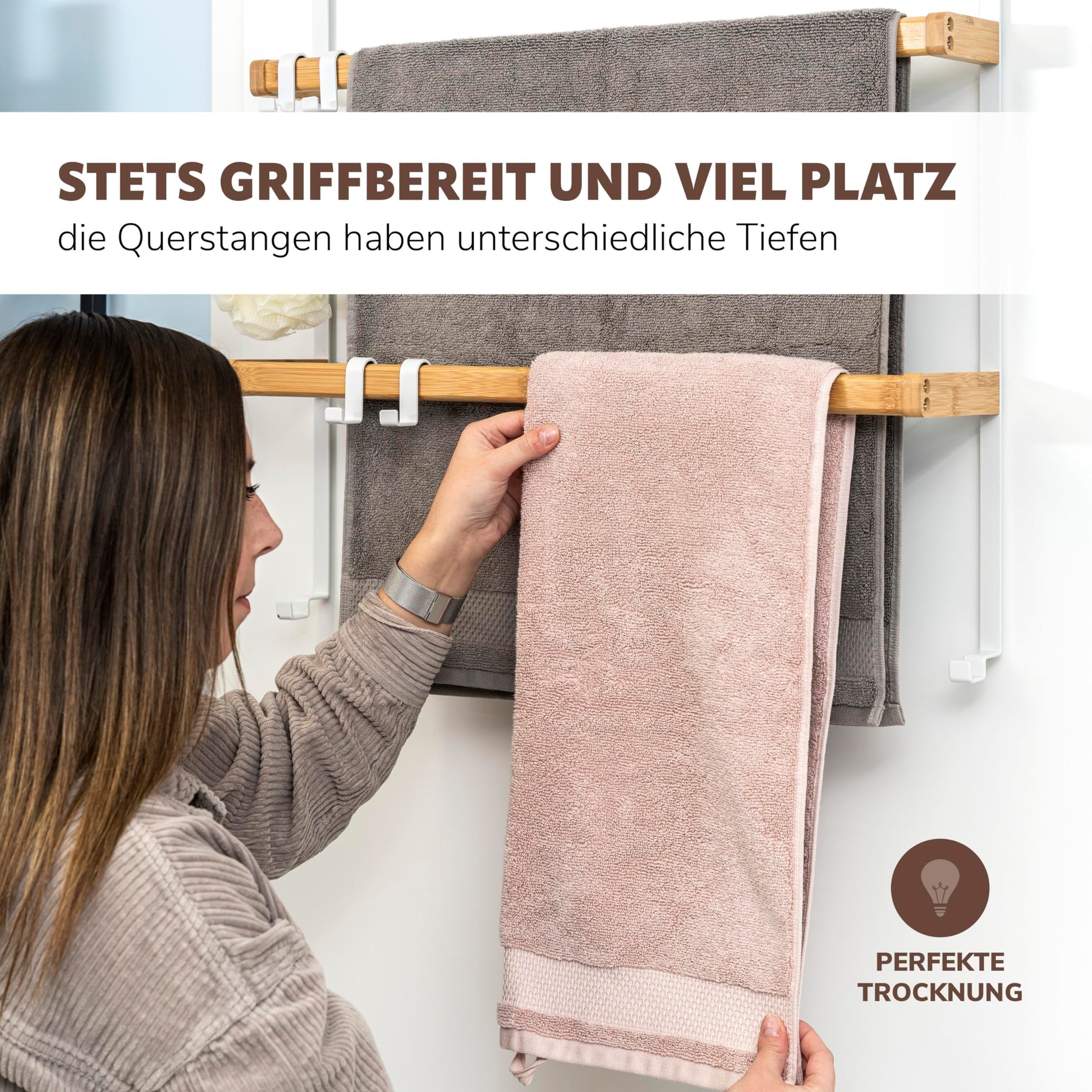 "STYLISH PRACTITIONER: The towel rack provides a stylish way to create additional storage space. Bamboo brings a warm yet modern atmosphere to your home! The shelf can be used on both the inside and outside of the door. Please note the door thickness of up to 2 cm.