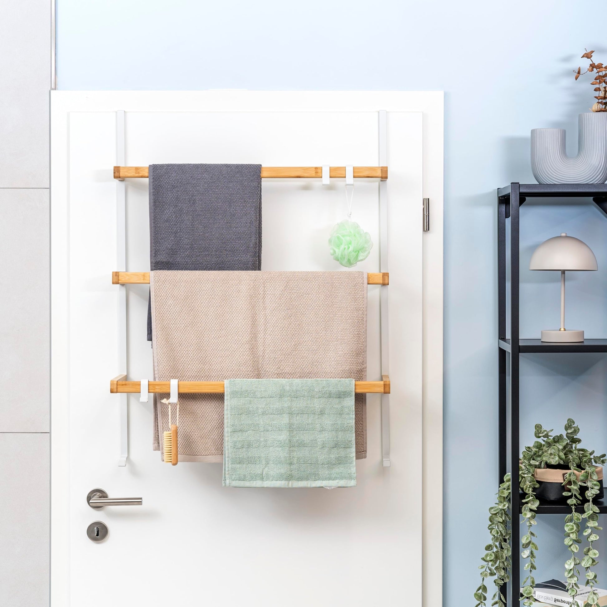 ["STYLISH PRACTICALITY: The towel rack offers a stylish way to create additional storage space. Bamboo brings a warm yet modern atmosphere to your home! The rack can be used on both the inside and outside of the door. Please note the maximum door fold dimension of 2 cm.",