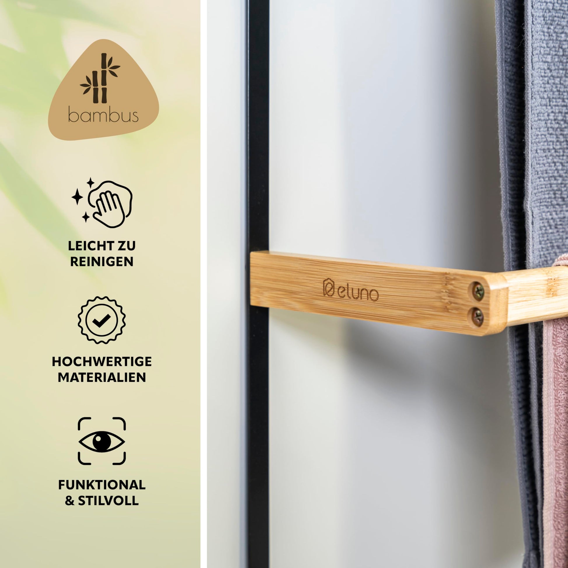 eluno Over-the-Door Hanging Shelf made of metal and bamboo, door towel holder with 3 towel bars, 4 handy hooks, for hanging without drilling (Black)