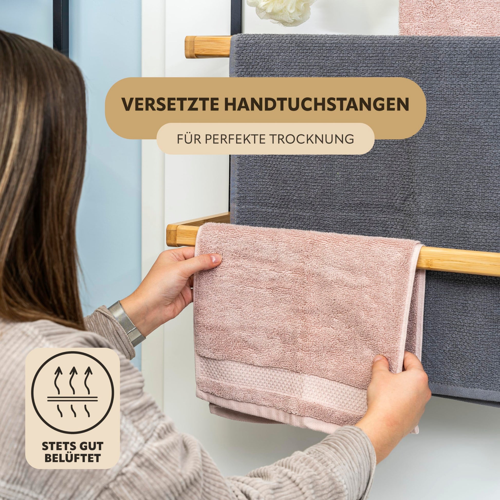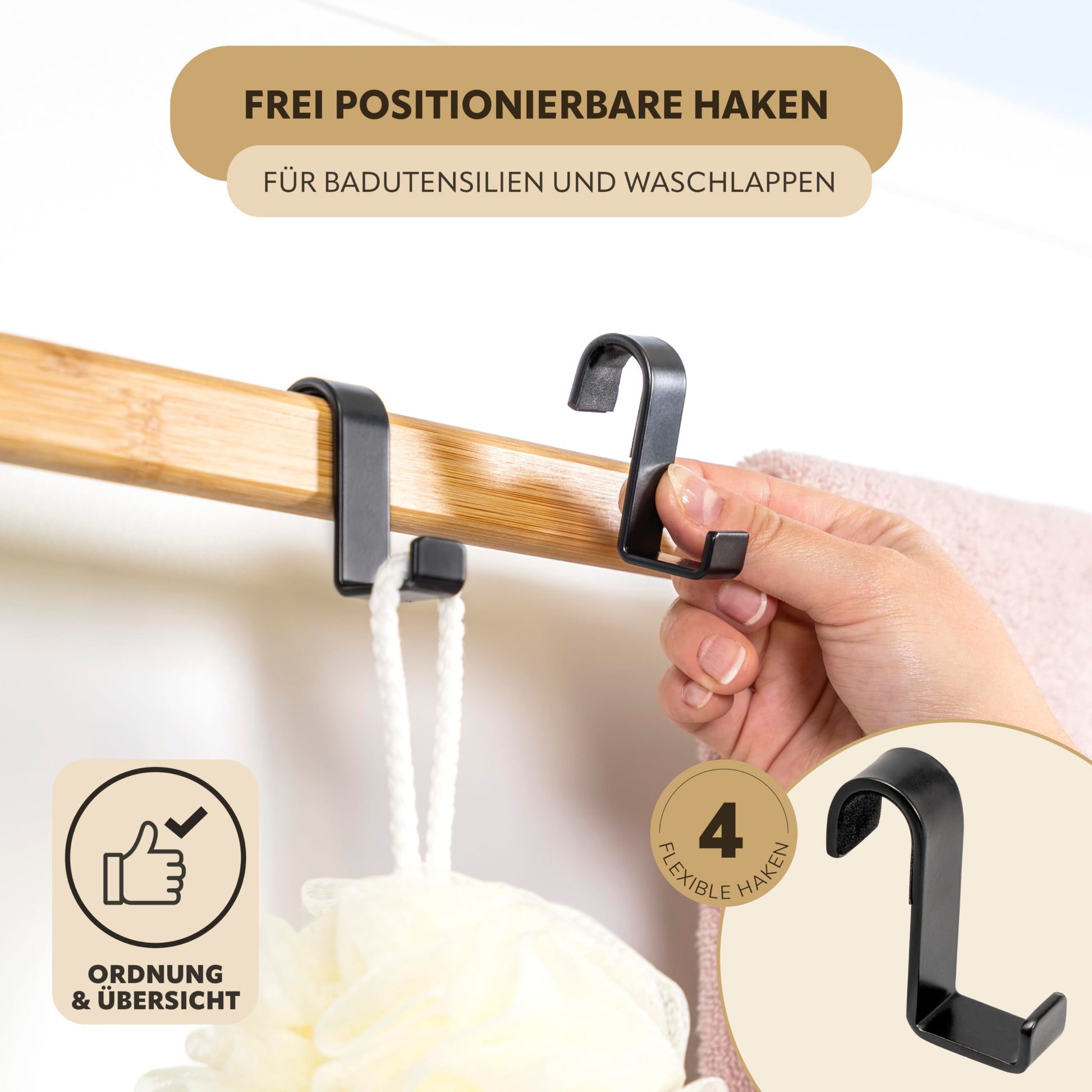 ["STYLISH PRACTICALITY: The towel rack provides a stylish way to create additional storage space. Bamboo brings a warm yet modern atmosphere to your home! The shelf can be used on both the inside and outside of the door. Please note the maximum door fold dimension of 2 cm.","VERSATILE: The door towel holder features 3 towel bars and 4 handy hooks to neatly store your towels and other items such as washcloths or small guest towels. The staggered bamboo slats in depth ensure proper towel drying.","NO-DRILL HANGING: The door shelf can be easily hung on doors without the need for drilling holes. The doors remain easily closable. Mounting materials and 8 EVA pads to prevent scratches and noise are included.","TRENDY MATERIAL DESIGN: The hanging organizer is made of sturdy, powder-coated metal and bamboo slats. This provides a modern, durable, and moisture-resistant material combination.","COMPACT DESIGN: The shelf has a compact size of approximately 65 x 86 x 20 cm (W/H/D), fitting on almost any door. The depth of the lowest slat is approximately 17.5 cm including pads and metal brackets."]