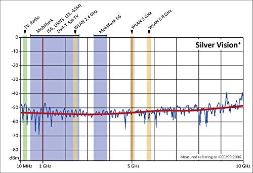 "Shielding attenuation: up to 60 dBm (equivalent to 99.9999%) of all relevant frequencies such as phone, WLAN, 5G"]