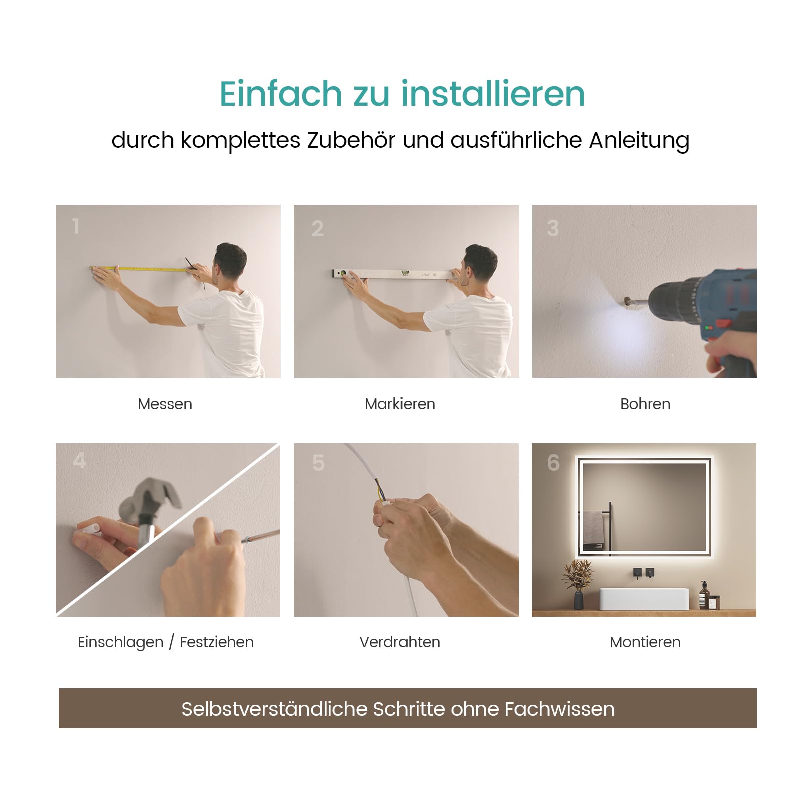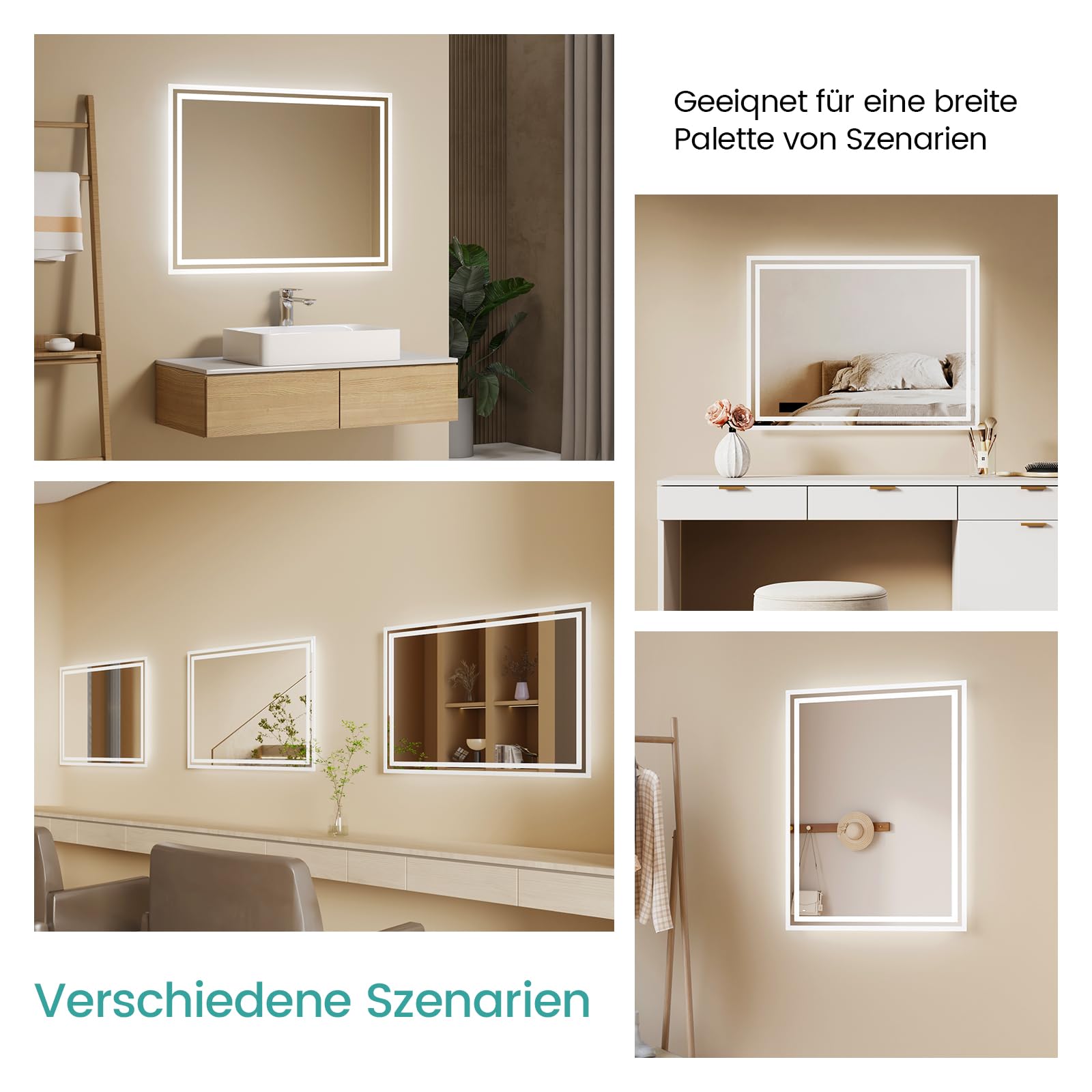 ["【Elegant Design】The EMKE bathroom mirror with lighting cleverly combines modern living style. The frosted edges give the mirror a unique and mysterious touch. The soft background lighting creates a cozy atmosphere in the bathroom and creates a warm ambiance.","【Multifunctional Bathroom Mirror】This bathroom mirror can easily switch between cold and warm light to meet different lighting needs. A separate anti-fog button effectively prevents fogging in the middle area of the mirror, ensuring clear visibility.","【Convenient Operation】This LED bathroom mirror can be easily operated via a side tilt switch and is compatible with wall switches (when the tilt switch is turned on). Choose your preferred mode of operation and enjoy a versatile experience.","【Simple Installation】The EMKE bathroom mirror is easy and flexible to install, vertically or horizontally according to your preferences. The four metal hooks on the back ensure a secure hold. With all mounting parts and a clear German manual, the installation can be easily done by one person.","【Worry-Free Purchase】Our bathroom mirrors with lighting are securely packaged to ensure they arrive undamaged to you. With our top-notch customer service and 14-day return guarantee, as well as a 2-year warranty, you can enjoy your purchase worry-free!"]