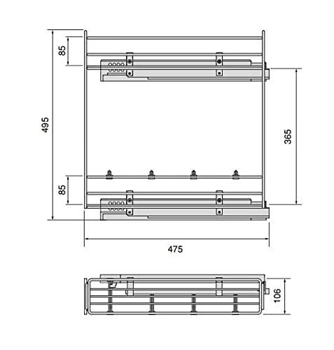 "Valid for modules with a minimum internal width of 112 mm and a minimum depth of 480 mm. Load capacity up to 30 kg. Chromed steel structure with 2 heights, the lower level has 4 indentations for bottles. Left side mounting by 2 roller guides with full extension and soft closing. Complete door adjustment (5D)."
