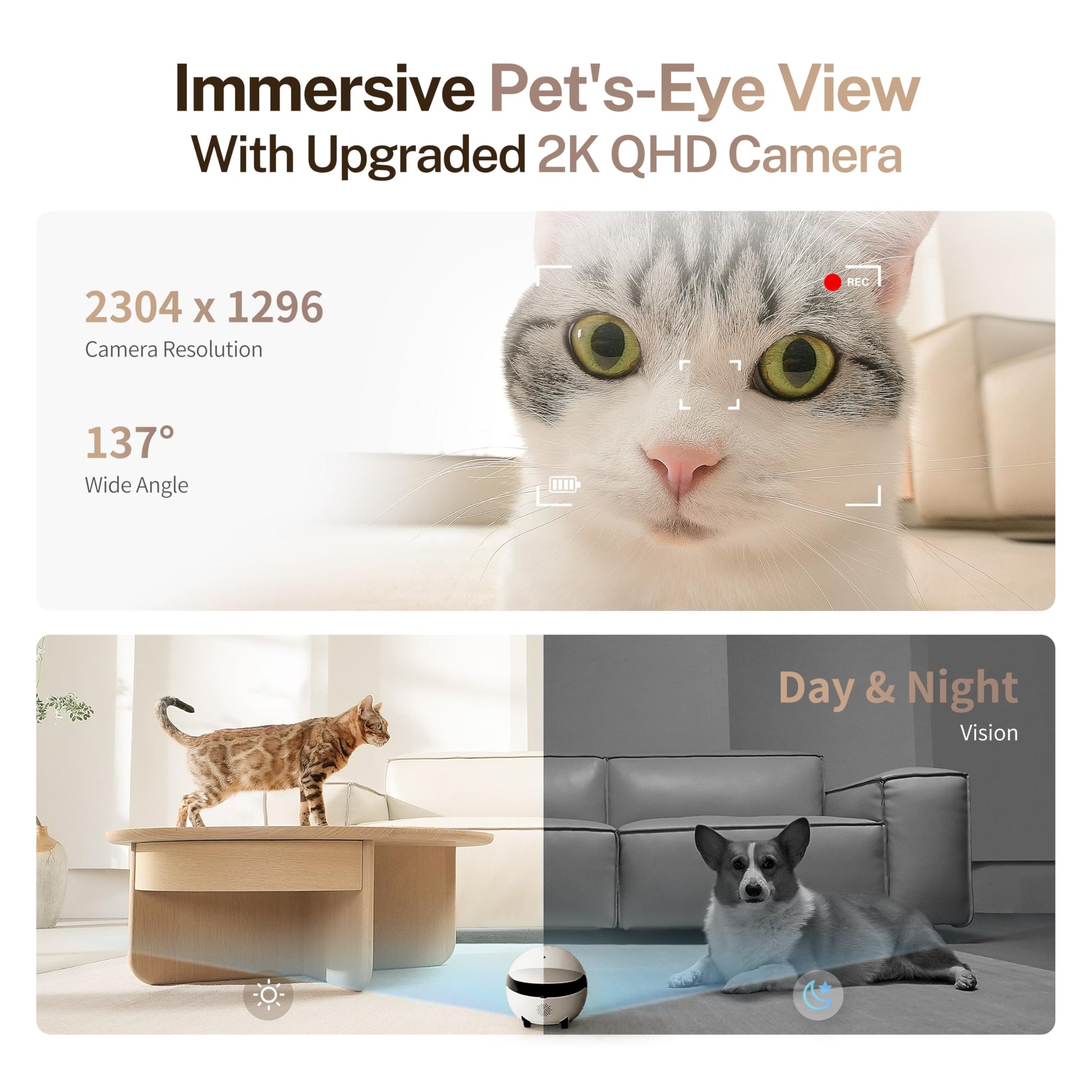 ["Adorable Robot & 2K Resolution: Roll and roam around, your pet's adventures come home! With 2K resolution, the ROLA Mini Pet Camera ensures stunning clarity in every cute moment.","Cute Eye Light & Multi-Device Sharing: Share the love, connect everyone! With an adorable eye light design, ROLA Mini adds extra charm to every snapshot. Share the camera robot with family and friends.","One-Touch Call & Two-Way Audio: Talk with ease, pet love made easy! Press the call button on ROLA Mini and it instantly connects to your phone. With built-in microphone and speaker, you can talk to your loved ones anytime, anywhere.","IR Night Vision & Video Recording: Capture the game, day and night! Equipped with four infrared LEDs, ROLA Mini also shows clear images in low light conditions. Includes 32GB memory card, never miss precious moments.","Battery Powered & Magnetic USB-C Charging: Long-lasting fun, powered on the go! ROLA Mini features a 5000mAh battery for extended playtime. With magnetic USB-C charging, charging is easy - just plug in and go.","Package Contents: ROLA Mini 2K Camera Robot x1, Magnetic USB-C Cable x1, 32GB MicroSD Card x1, User Manual x1"]