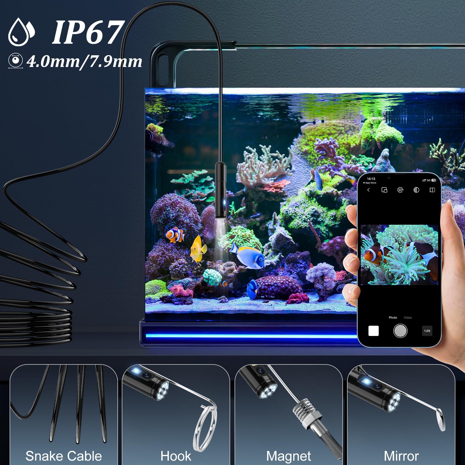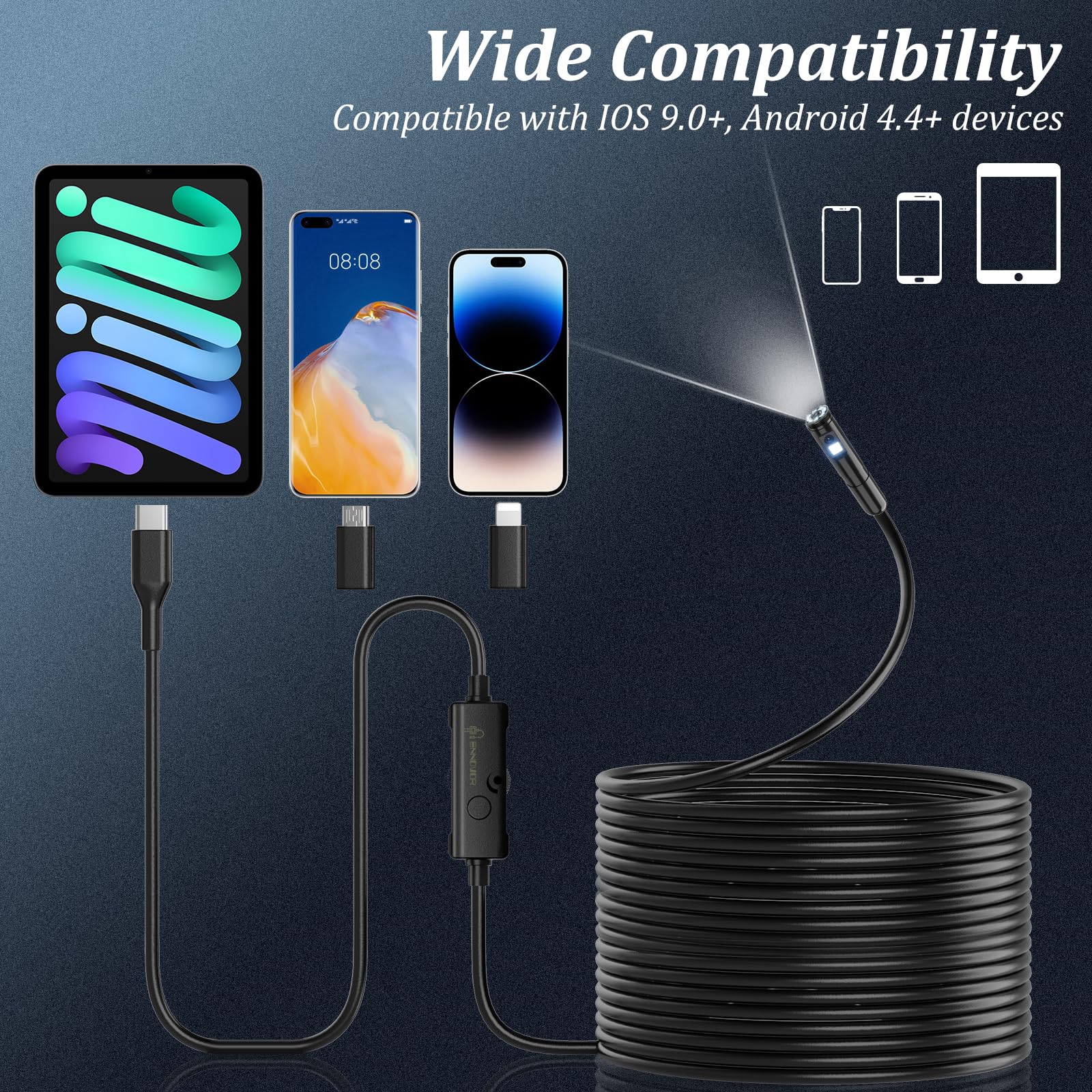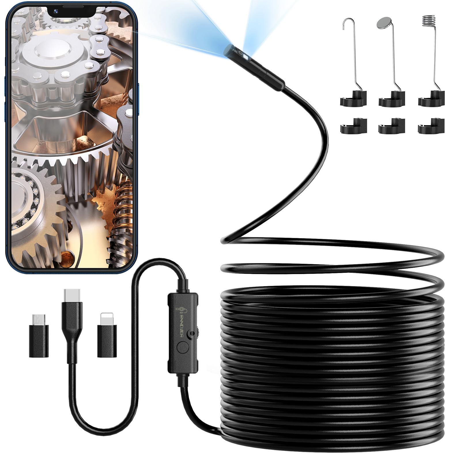 ["【1920P HD Pixel Dual Lens】The dual head endoscope camera with light features 1920P HD pixels to display clear images and videos. 8+1 adjustable LED cameras also ensure clear images in dark environments. The endoscope camera is equipped with a 7.9mm probe, which is compact and portable","【Wide Compatibility】The inspection camera comes with an iPhone/Micro-USB adapter. The endoscope is compatible with Android devices with OTG function (Important: Please confirm before purchase that your Android phone supports OTG function). Simply plug in and start using for iPhone","【Easy to Use】Search for "SUP-ANESOK" in the App Store, download and install it. Or scan the QR code and download the app. The endoscope camera for mobile phone is suitable for systems with Android 4.4+ and iOS 9+ and higher. No Bluetooth or Wi-Fi connection is required for the endoscope, it does not need to be charged separately, and you don't have to worry about connection errors","【Semi-rigid and IP67 Waterproof】The channel camera has a 10-meter semi-rigid cable, which allows for more convenient control during operation, the snake camera achieves a balance between stiffness and flexibility. The channel camera is waterproof to IP67 and can be used as an underwater camera, waterproof telescopic camera, car detector, channel detector, etc.","【Package Contents】10m endoscope camera*1, magnet*1, hook*1, mirror*1, holder*3, iPhone/Micro-USB adapter, user manual*1"]