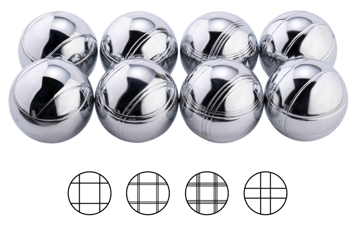 ["For playing in the garden, on squares and paths, at the beach and more.","Metal balls with chrome-plated, satin finish for good grip Dimensions per ball: Ø 74 mm, Weight: 720 g each","Easily visible on the playing field thanks to four different line patterns","8 metal balls, 1 small wooden target ball","Carrying bag with practical balls"]