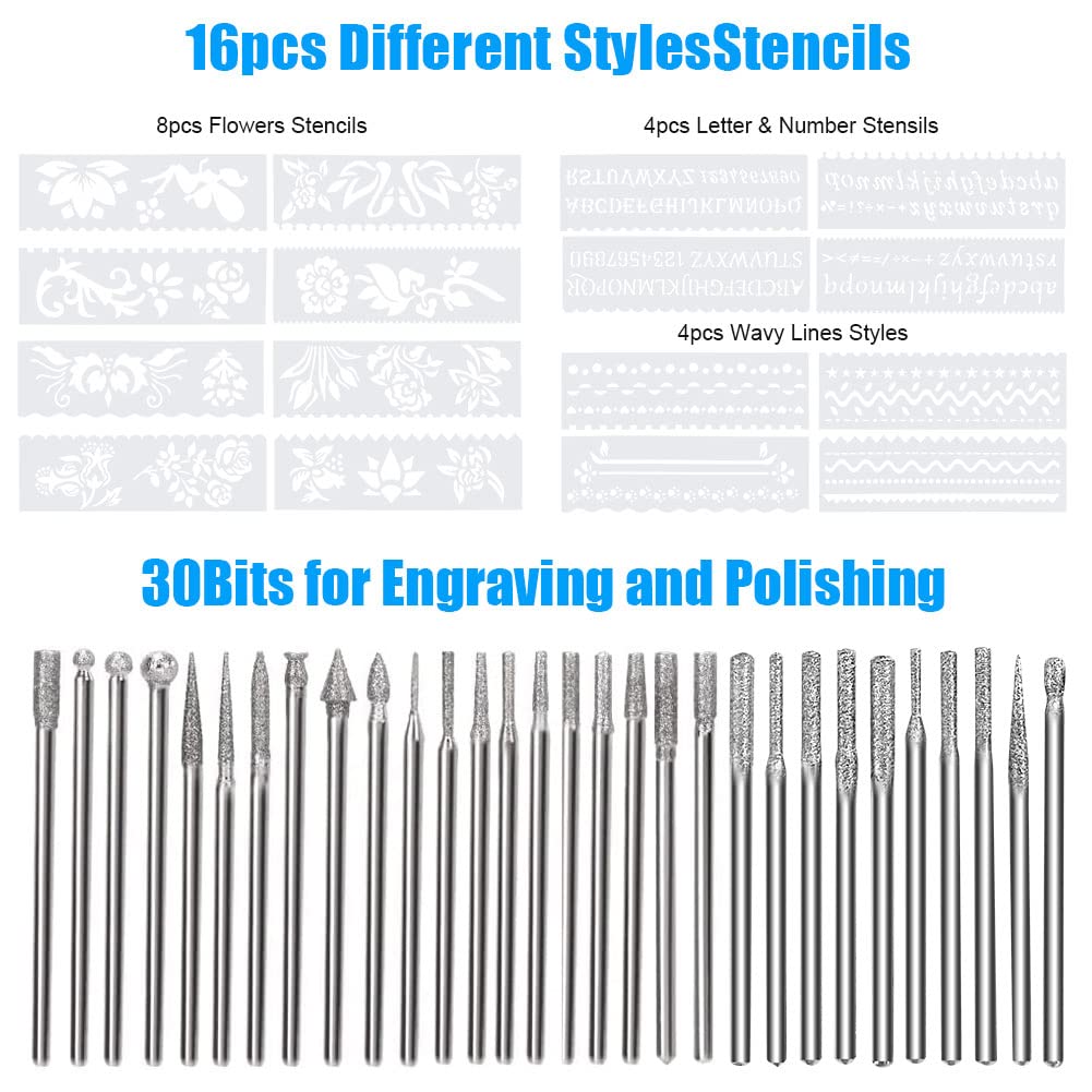 ["[USB Wireless Engraving Pen] This metal engraving pen is equipped with an excellent motor and a lithium battery, and can be charged via a USB interface. Power up to 10 W during operation. Wireless use lasts up to 30 minutes idle after a full charge.", "[Visible 3-Speed Setting] 3-speed adjustable speed 5000-18000 rpm, suitable for various occasions. With the lowest speed, you can safely polish your nails, and with the highest speed, you can also engrave metal. With power, speed, and overload indicator lights, making usage more convenient for you.", "[Multiple Accessories] These metal engraving machine kits include 20 diamond drills (2.35 mm), 2 drills (1 mm, 1.5 mm), 3 saw blades (22 mm, 25 mm, 32 mm), and 1 mandrel rod. This accessories are sufficient for engraving, carving, grinding, polishing, etching, milling, grinding, drilling, cutting.", "[Wide Usage] This multifunctional etching pen kit can be used as a micro-engraving pen to engrave a variety of materials such as metal, stone, plastic, glass, ceramic, wood, leather, not only for carving and grinding, etching, milling, grinding, drilling, cutting.", "[Best Gift] This portable and compact etching pen is easy to carry, so you can enjoy jewelry making easily, easy to use and suitable for beginners. Use our set to make keychains and homemade necklaces as gifts."]