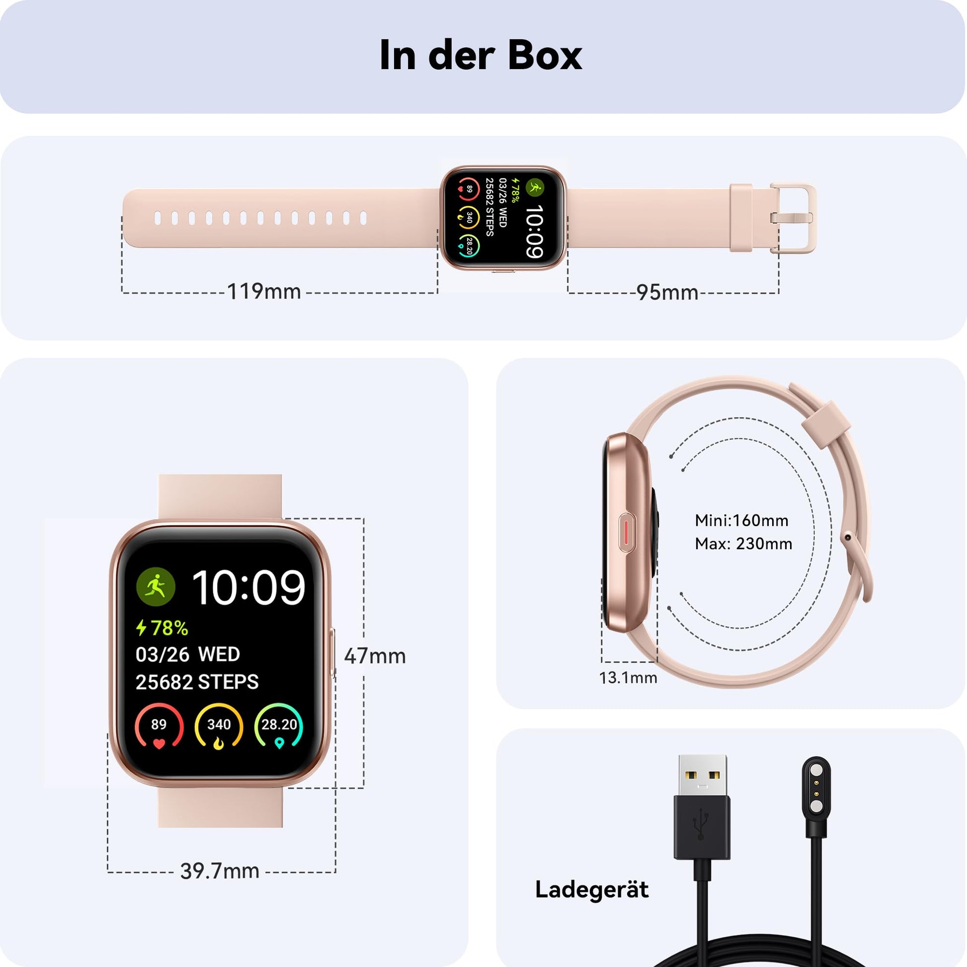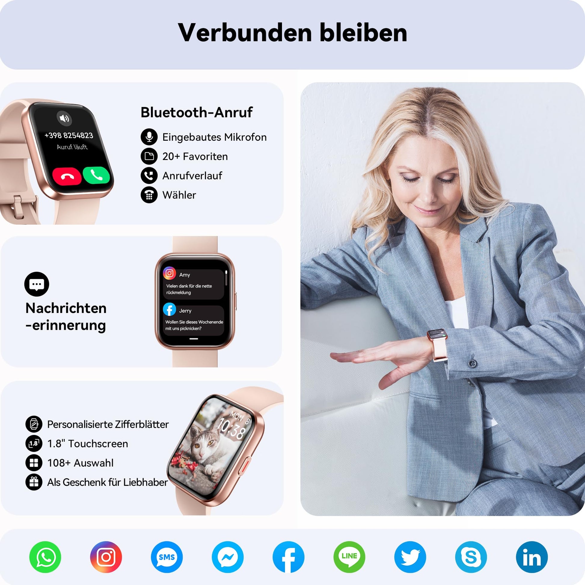 ["【Smartwatch for women with phone function】With built-in speaker and microphone, you can make or answer calls directly on the smartwatch after connecting to the phone, your contacts will be synced. The women's smartwatch is equipped with BLE 5.1, which provides a faster and more stable connection. It also supports real-time message notifications from social apps like WhatsApp / Facebook / Instagram / Skype, etc.","【Daily Activity Tracker】Equipped with a high-precision sensor, the women's fitness watch can accurately track your heart rate 24/7, automatically track and record sleep, detect blood oxygen, helping you understand your physical condition and make appropriate adjustments. In addition, the women's pedometer watch has a reminder function for the female cycle to maintain women's health.","【24 Sport Modes & IP68 Waterproof】The smartwatch for men with phone function has over 24 built-in sports modes to meet your daily training needs. The women's pedometer watch can track step and distance data in real-time, and you can view GPS routes on your phone. With IP68 waterproof rating, you can use it for handwashing or running. The waterproof smartwatch is equipped with a vibration drainage function that can help remove water.","【1.8-Inch Full Touchscreen and Personalized Watch Faces】With a 1.8-inch full touchscreen and a high resolution of 240 x 280, our smartwatch for phone calls provides you with images in excellent HD quality and a fantastic visual experience. In the "Veryfit" app, there are over 100 different types of watch faces available. You can also customize your own women's pedometer watch faces in the smartwatch app.","【Multifunctional Women's Pedometer Watch】In addition to the built-in Alexa function, the smartwatch for women with phone function has many other features such as weather forecast, music control, alarm clock, activity reminder, etc. Compatible with devices running iOS 9.0+ and Android 6.0+. The built-in battery lasts 7 days with normal use and 25 days on standby. The stylish watch is a great gift for yourself, family, and friends to motivate them to move and stay healthy."]