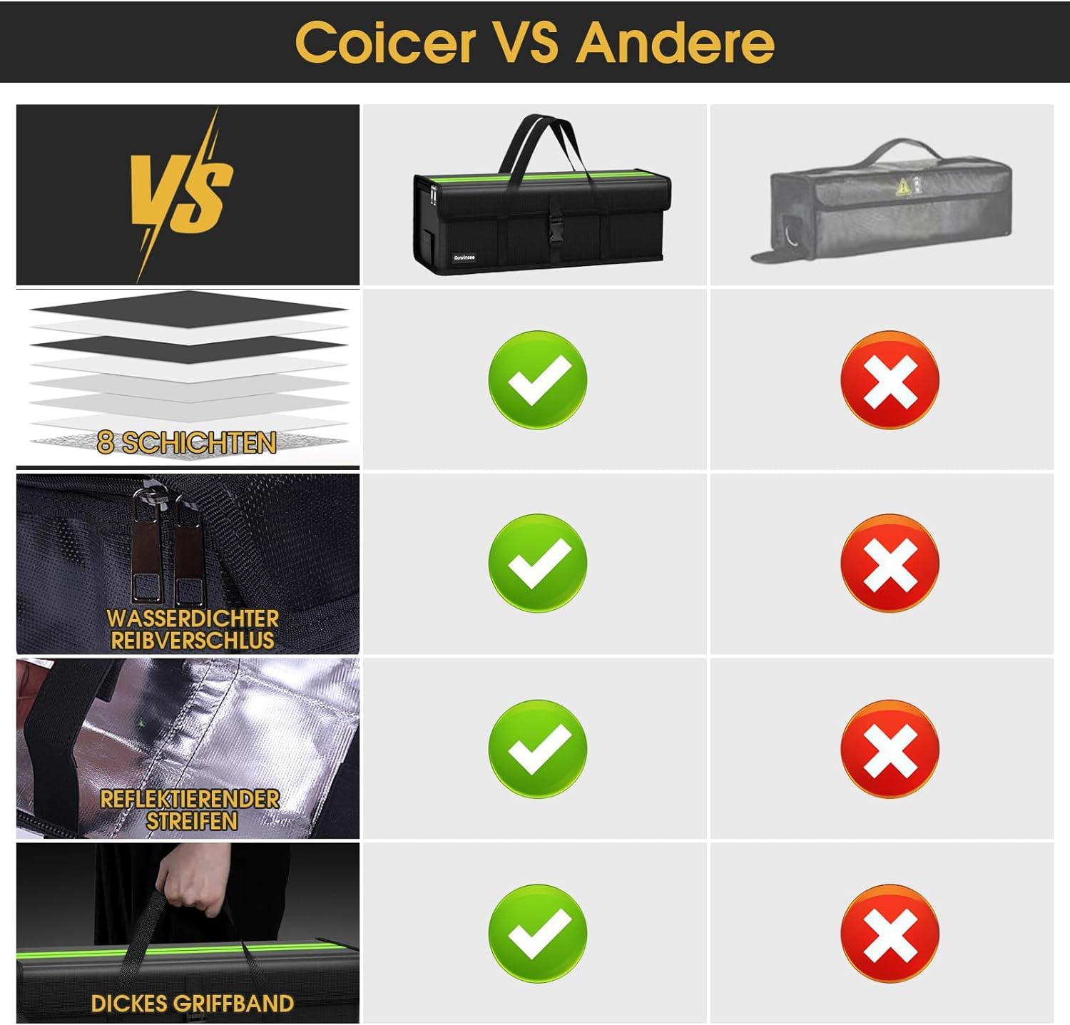["Fireproof, waterproof, and explosion-proof】This E-Bike battery bag, with an inner layer made of high-quality fiberglass and flame retardant insulation cotton consisting of 8 layers of fireproof fabric with a temperature resistance of 2300 °C, provides maximum protection. The outer layer, coated with waterproof silicone, is fire and explosion-proof, preventing battery short circuits caused by water ingress.","【Large capacity】With dimensions of 41 x 13 x 12 cm, this extended E-bike battery bag offers ample space for various E-bike batteries such as PowerPack 750, PowerPack 625, PowerPack 500, etc. Even larger batteries fit easily here.","【Safe charging】The double-sealed design with Velcro and zipper ensures a secure closure of the battery bag during charging. In the event of a battery fire, this sophisticated double-layer system effectively slows down the spread of gases and flames.","【Comfortable transportation】Two non-slip silicone straps stabilize the battery during transportation, prevent wobbling, and allow for convenient shoulder carrying. Additionally, this remarkable fireproof battery bag is foldable and space-saving for storage.","【Safety certification】Our fireproof battery pack has passed UTL certification and meets the highest safety standards. With our professional after-sales service, we are available for any questions and offer unconditional refund after-sales service for your secure purchase. (Already design patents)"]