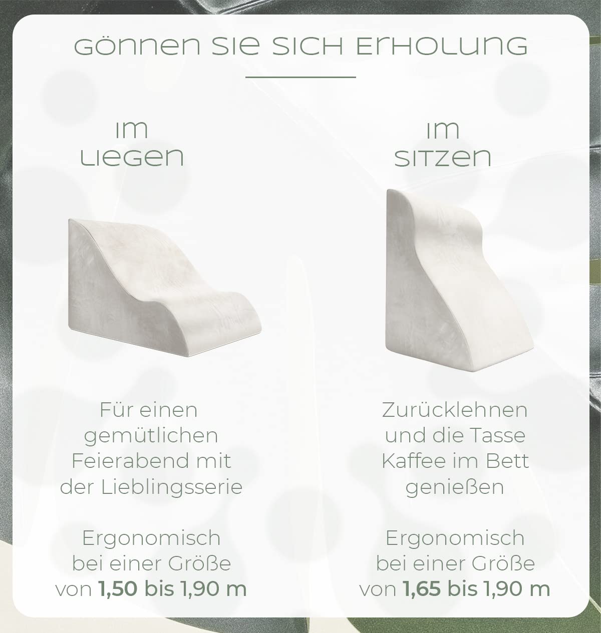 ["✅ ERGONOMIC SUPPORT PILLOW – Relieve back and neck pain with the support pillow. The perfectly matched foams provide optimal back support for relaxation for individuals between 1.50m and 1.90m up to max. 87 kg","✅ MAXIMAL COMFORT – The anatomical pillow shape combined with memory foam makes lying down and sitting especially comfortable. Relax with a healthy posture using our wedge pillow for the back","✅ ANTI-GERM WEICH - The reflux pillow has a fluffy soft polyester cover with an integrated zipper that can be washed at 40° C.","✅ ERGONOMIC DESIGN – Adapted to the natural shape of the spine, the reading pillow is ideal for watching TV, gaming, reading, or working. Its shape stability also allows it to be used as a headrest and bed headboard.","🌱 ECO-FRIENDLY - The bed wedge is compressed for transportation. This allows significant savings in pollutants throughout the transport chain. The seat wedge fully expands in 5-7 days"]
