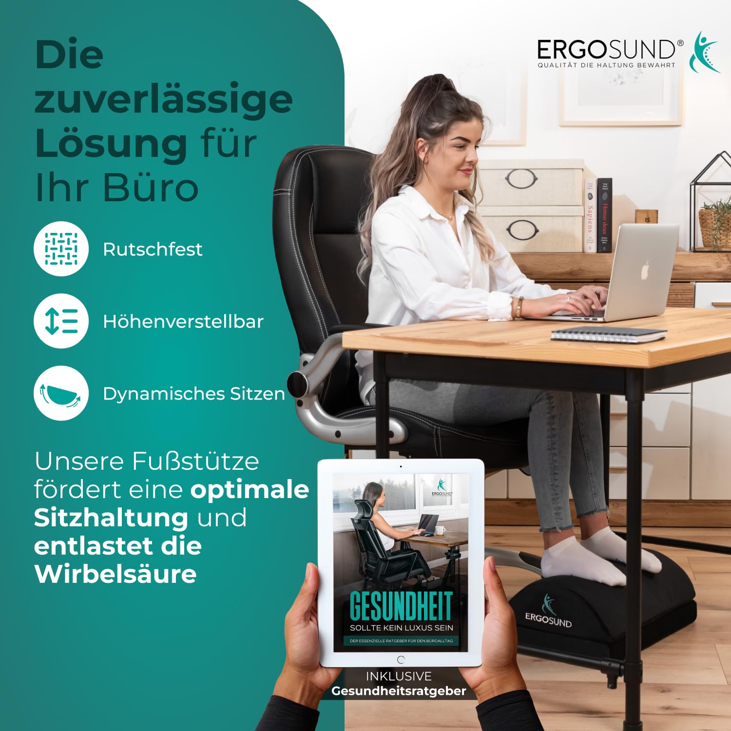 ["TOO MANY PEOPLE SITTING AT DESKS are harming themselves with an unhealthy posture! We help you improve your sitting shape & body position at work!","ERGONOMIC FOOT REST - Our foot rests are made of high-quality 32D special foam only! This ensures the optimal support for your posture at work, as well as fantastic & long-lasting quality!","GOODBYE SLIPPERY & POORLY MADE FOOT RESTS! Whether on laminate or carpet, our improved "Anti-Slip Concept" of the desk foot rest provides rock-solid grip on any type of floor, without any color transfer!","HEIGHT ADJUSTABLE AND VERSATILE - Whether at home office or in the office, our height-adjustable footstool can be perfectly adapted to your needs and any new situation! And all within seconds - with just one hand!","ERGONOMIC MARKET LEADER - Proudly delivering quality that maintains posture! If you are still dissatisfied with our desk footrest, you can easily return the foot cushion to us. Do yourself & your posture a favor!"]