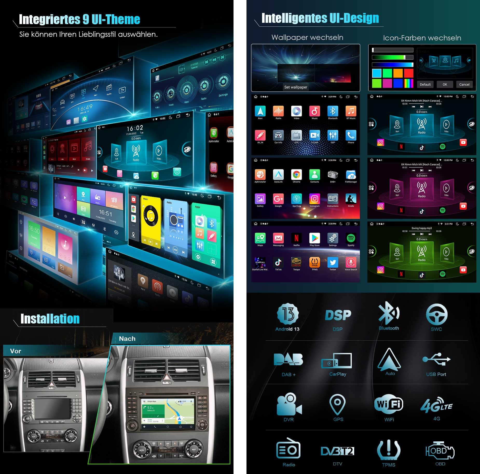 ["Android 13.0 OS, 8-Core, 4GB RAM+64GB ROM 7 Inch Car Stereo with GPS for Mercedes W169 W245 VW Crafter with powerful Android 13.0 system. Eight-core, 2* A75+6* A55 64-bit 2000MHz CPU architecture, benchmark results exceed 200,000. 2 card & 3 USB up to 5 * 256GB expanded storage. Multi-Touch IPS Screen, Integrated 8 Theme UI style. Supports video output, need to buy a converter to use it. CANBUS decoder included.","Support Steering Wheel Control & GPS Navigation Steering wheel control support, you can use this feature to control your music or volume on the steering wheel; For GPS function, you can download online GPS apps like Waze, Sygic, and other apps from the Play Store or access an offline map source from map providers to use satellite navigation. And you can use navigation while listening to music or radio.","Wireless CarPlay & Wired Android Auto & DSP Built-in CarPlay/Android Auto module. It allows users to make calls and listen to music. Simply connect your iPhone via Bluetooth to this device to use CarPlay, or connect your Android phone via USB to use Android Auto. This car stereo also features a built-in DSP amplifier. The 30-band equalizer adjusts to your taste and listening environment.","Multi-functions Bluetooth function can free your hands and make your driving safer; Support steering wheel control, you can use this feature to control your music or volume in the car; Support Torque Pro OBD2/DVR/TPMS/TV/DAB+ system; Rear camera input and reverse trigger control. It has built-in WiFi, allowing you to freely browse the internet.","Compatibility Car stereo suitable for Mercedes Benz A-Class W169 2005 to 2012; For Mercedes Benz B-Class W245 2005 to 2012; For Mercedes Benz Sprinter Viano Vito from 2006; For VW Crafter from 2006. The front panel size is 244mm(Upper Wide)*130mm(High)*240mm(Bottom Wide). Please check your dashboard size before purchasing to avoid mistakes."]