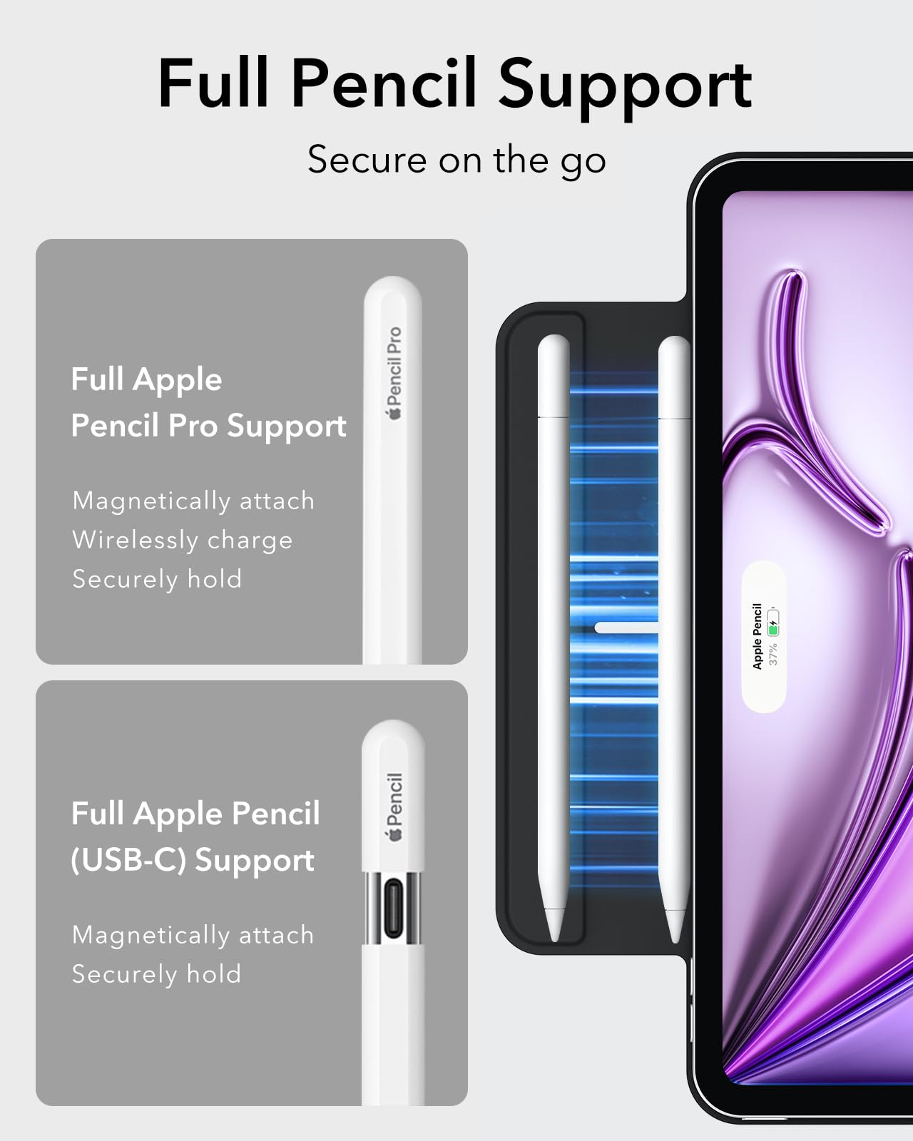 "Supports Pencil Pro and Pencil (USB-C): This iPad Pro case fully supports the Pencil Pro and features a deep side groove for magnetic charging and a magnetic closure to secure your Pencil"