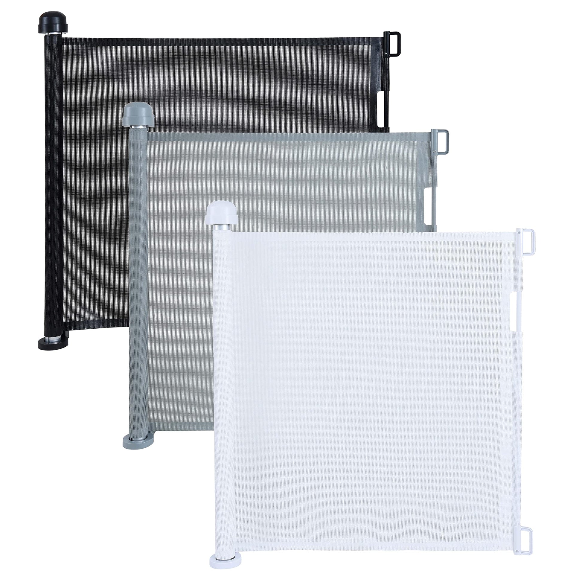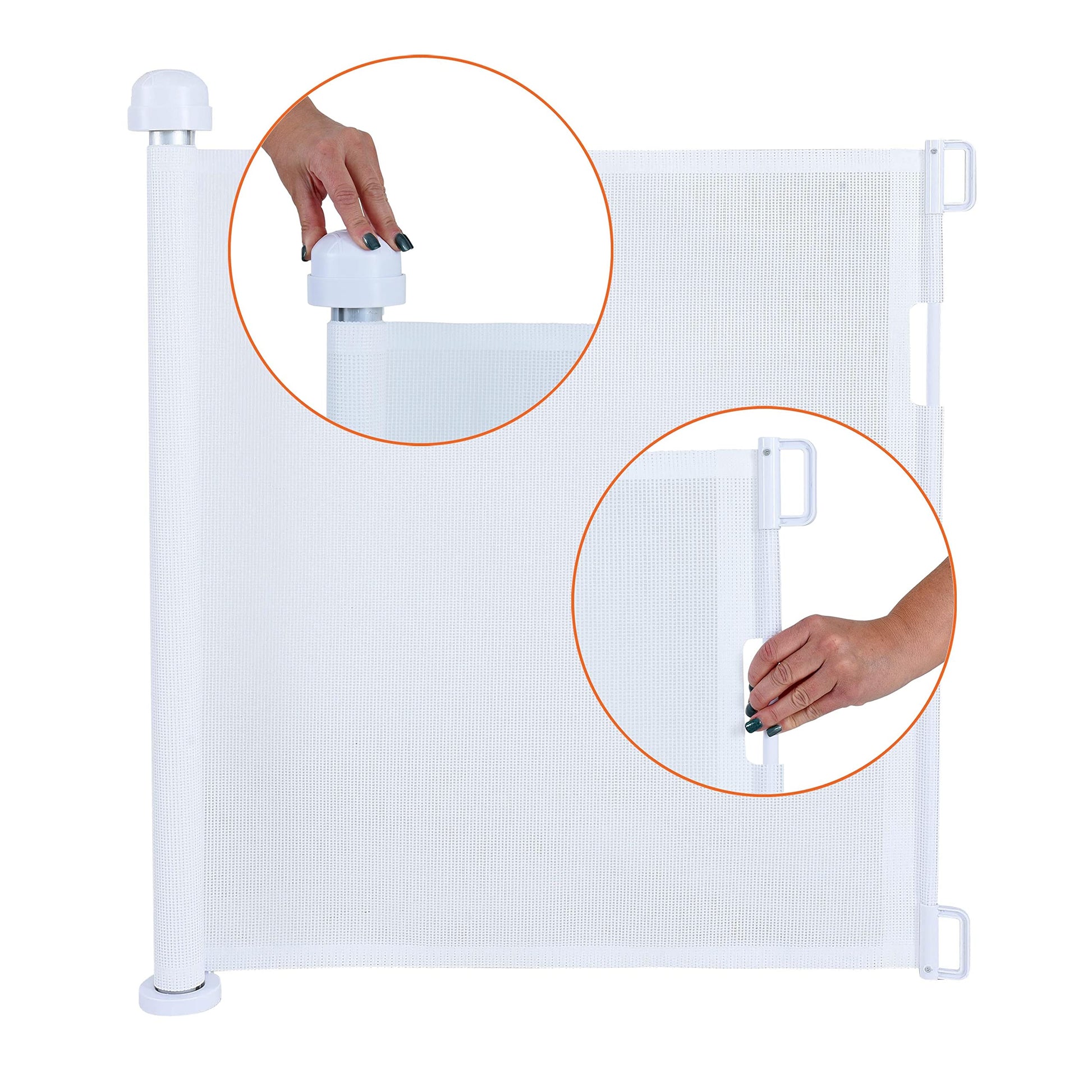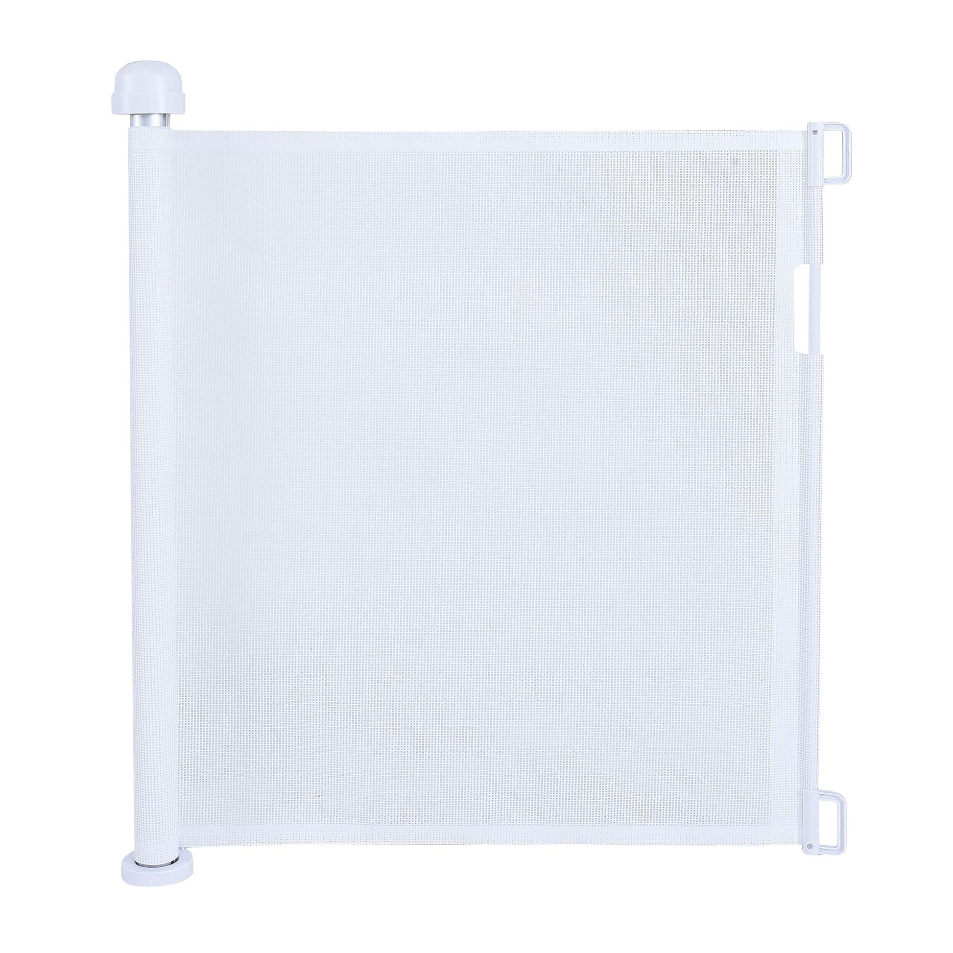 ["High-quality door safety gate suitable for babies/toddlers up to 2 years old and pets up to 40 pounds","Retractable door safety blind - minimal space requirement; one-handed operation possible","With double lock - childproof; Material: aluminum, plastic, PVC fabric; Height of PVC mesh: approx. 78 cm","Recommended unfolding size (HxW): approx. 80 cm x 140 cm; Maximum size (HxW): approx. 80 cm x 150 cm","Note: The colors in the photos may vary from the actual color depending on the monitor settings."]