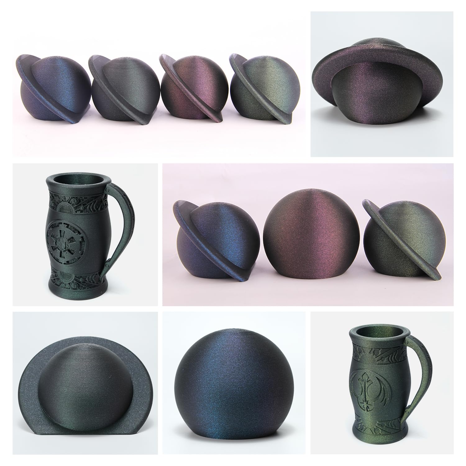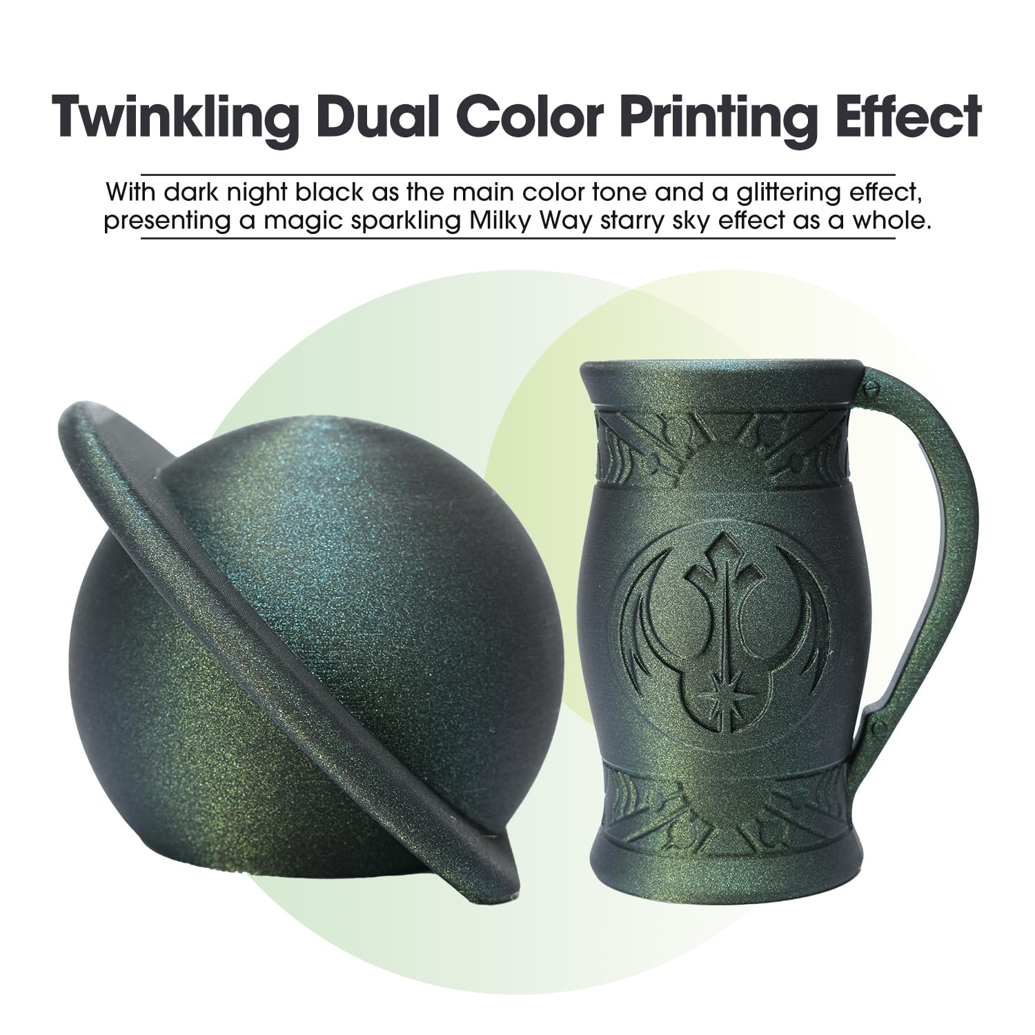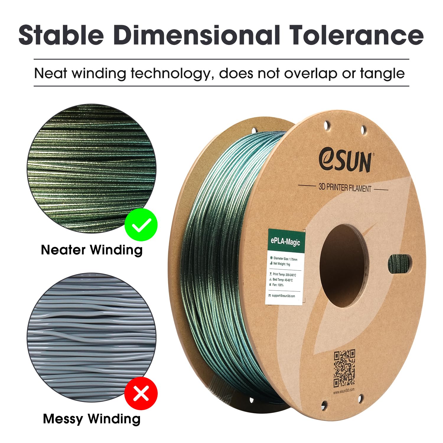 ["【Dual-Color Magic PLA】:eSUN ePLA-Magic pla is modified based on ordinary PLA material, so it not only retains the properties of easy printing of PLAs, but also adds a fantastic two-color, twinkling texture.","【Twinkling Appearance】:eSUN ePLA-Magic pla, inspired by the Milky Way, is created by using the dark night as the background and the twinkling starlight as the background, intertwining and changing to give the model a dazzling appearance.","【Stable Dimensional Tolerance】: eSUN ePLA-Magic pla has minimal tolerance and low deformation to ensure consistent feeding and stable prints, good layer adhesion, less stringing, no bubbles, and no cracks, resulting in excellent surface quality and high precision.","【Tangle Free & No Plugging】: eSUN ePLA-Magic pla has good roundness, very tight diameter tolerance, and good winding, and it does not overlap or tangle. It can be applied in many areas such as cultural creativity, animation industry, film and television props, etc.","【Vacuum Sealed Packaging】: eSUN ePLA-Magic pla is delivered in a sealed vacuum bag with a desiccant bag, keeping your 3D printer filaments in an optimal storage condition and free from dust or dirt before opening the vacuum sealed packaging."]