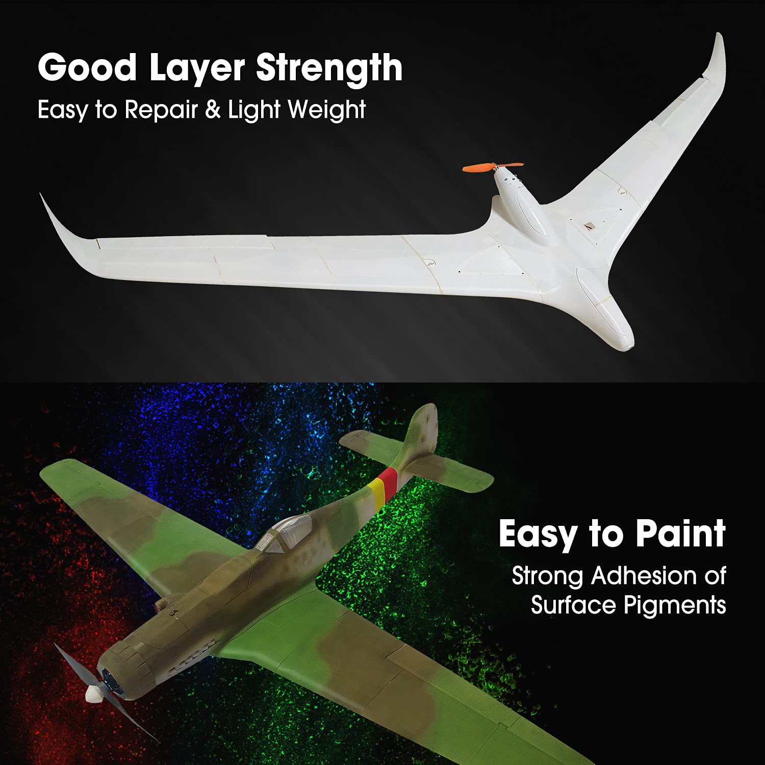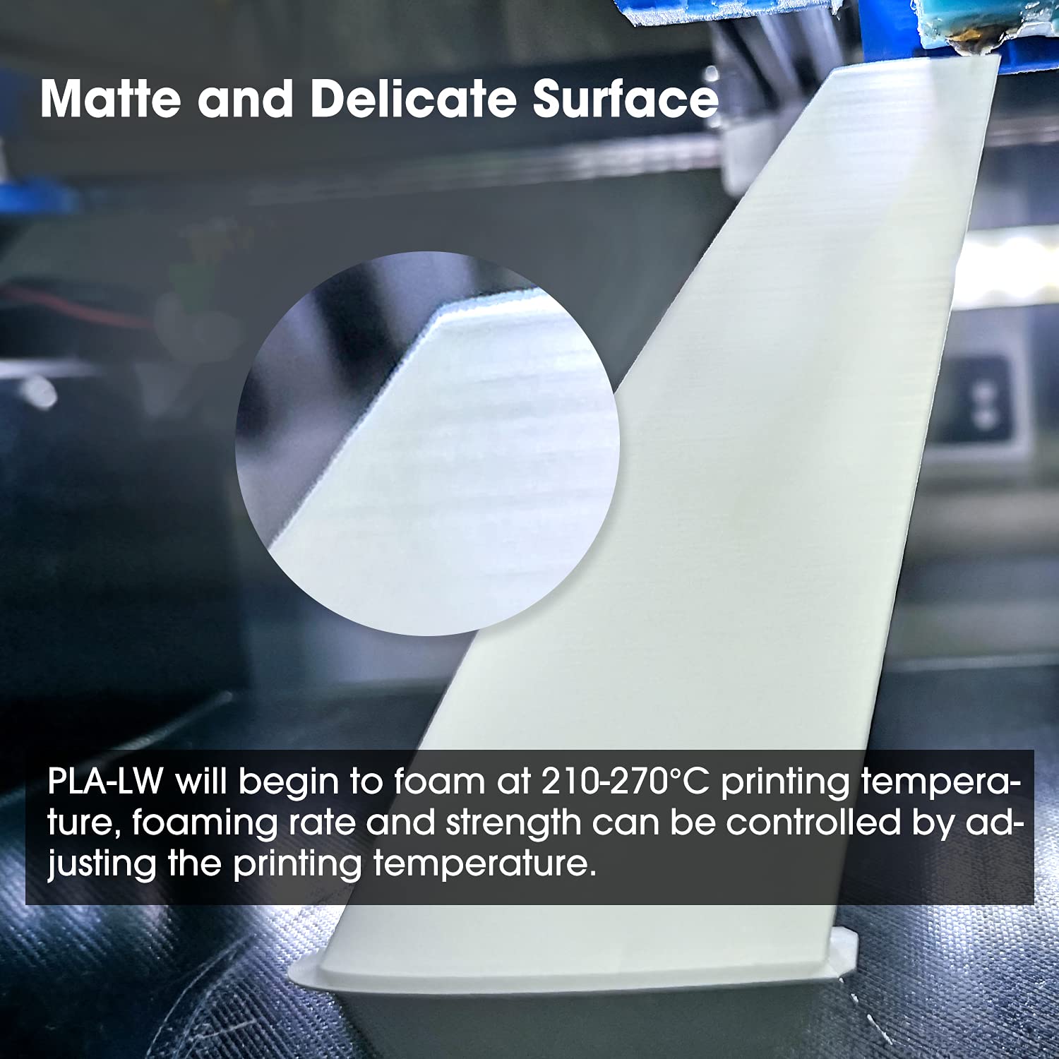 ["【Lightweight PLA】PLA-LW starts foaming at a printing temperature of 210-270℃. At a maximum foam rate of 122% (270℃), its volume increases by nearly 1.2 times. The minimum extrusion rate can reach 45% to print projects with low weight and low density using active foam technology.","【Foaming Material】When printing the same volume model, 1 spool of PLA-LW filament is equivalent to 2.2 spools of ordinary PLA filament, the foam volume ratio can reach 220%, saving 55% of material. Foam rate and strength can be controlled by adjusting the printing temperature.","【Proficient for Model Aircraft】Specially designed for model aircraft enthusiasts. Lightweight. Low density 0.54 g/cm³. Lighter wing loading. Lower stall speed. Better model aircraft performance. Widely used in model aircraft, drones, COSPLAY, and other areas.","【Matte and Delicate Surface】Excellent surface effect, basically no layer structure; good layer adhesion, easy to repair; easy to paint, strong adhesion of surface pigments. Minimal tolerance and low warping to ensure uniform feed and stable prints without nozzle or extruder clogging.","【Please Note】The foam rate depends on the printing temperature, printing speed, and size of the nozzle melt cavity. Please compare the wall thickness of the model and design according to your printing situation and adjust the extrusion rate, temperature, speed, and other printing parameters accordingly."]