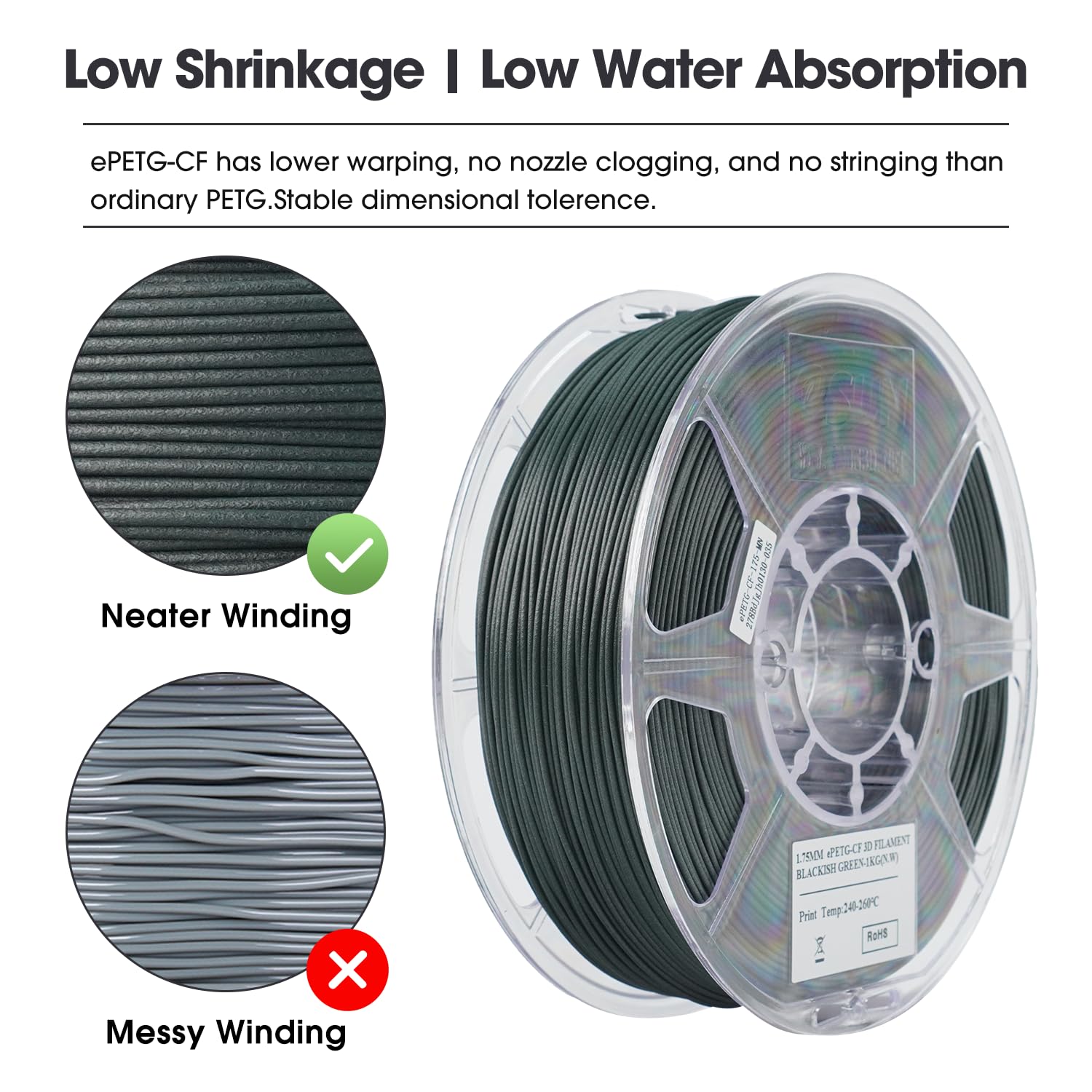 ["【Carbon Fiber Filled PETG】: eSUN ePETG-CF adds carbon fiber to increase strength and hardness. And the wear resistance and stiffness of the material have been greatly improved based on normal PETG filaments.","【Good Printability】: Compared to ordinary PETG filaments, eSUN ePETG-CF has less warping, less nozzle clogging, and less stringing to ensure good printing performance. And with tight diameter tolerance and good winding, it does not overlap or tangle.","【Matte Appearance】: Thanks to the addition of carbon fiber, eSUN ePETG-CF brings a matte appearance and a unique carbon fiber matte texture, allowing you to print models with less visible layering.","【Applicable Scenarios】: eSUN ePETG-CF can be used for 3D printer accessories, fixtures, models, electronic devices, household appliances, automotive parts, etc. And it is compatible with most FDM printers.","【Stable Tolerance & Low Deformation】: eSUN ePETG-CF is designed with minimal tolerance and low deformation to ensure uniform feed and stable prints, good layer adhesion, less stringing, and easy handling, resulting in excellent surface quality and high precision."]