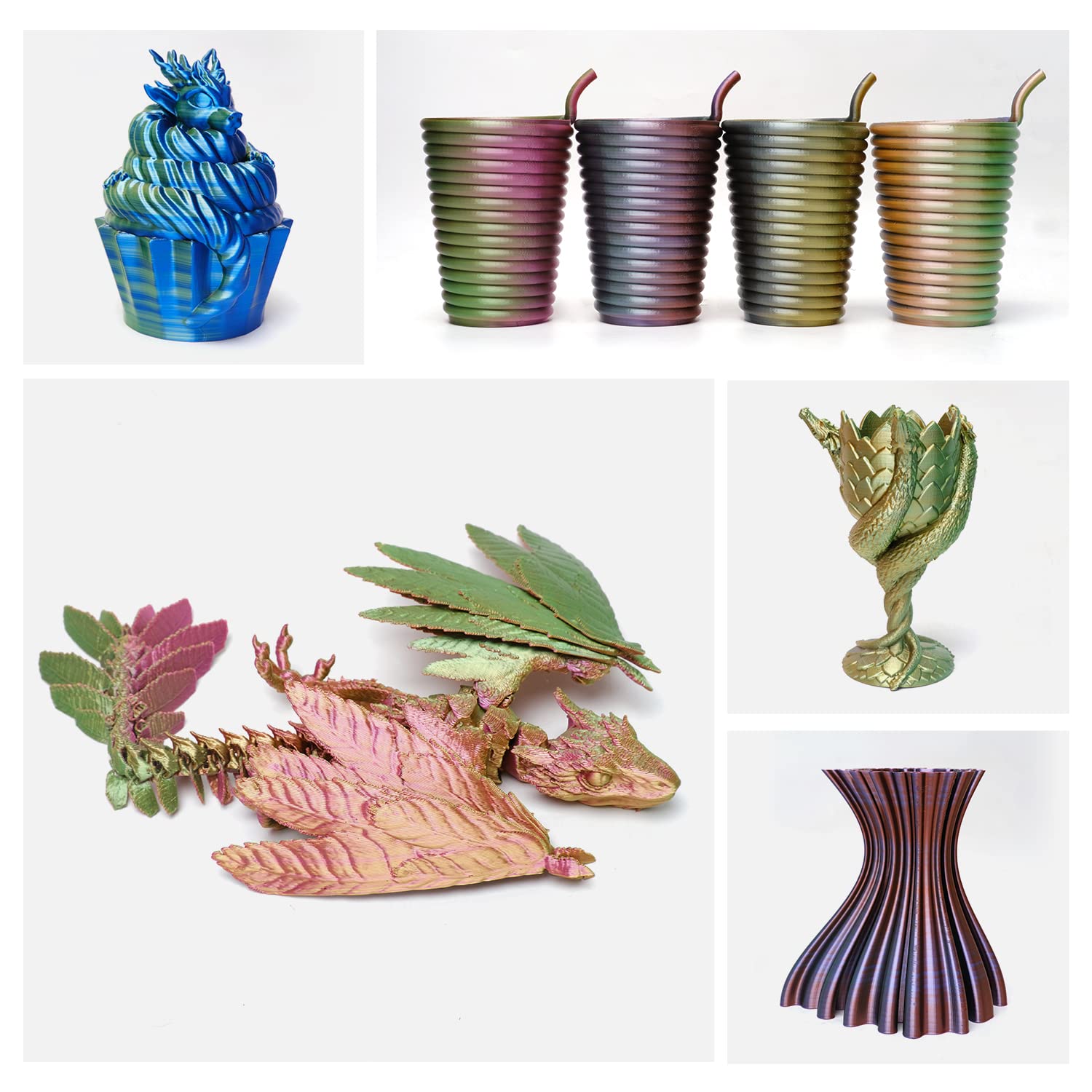 ["【Silk Mystique PLA】Combining three individual colors of Gold, Green, and Black extruded into a filament strand. Parts can be printed with different colors from front to back by changing the visible color of the filament in different directions.",