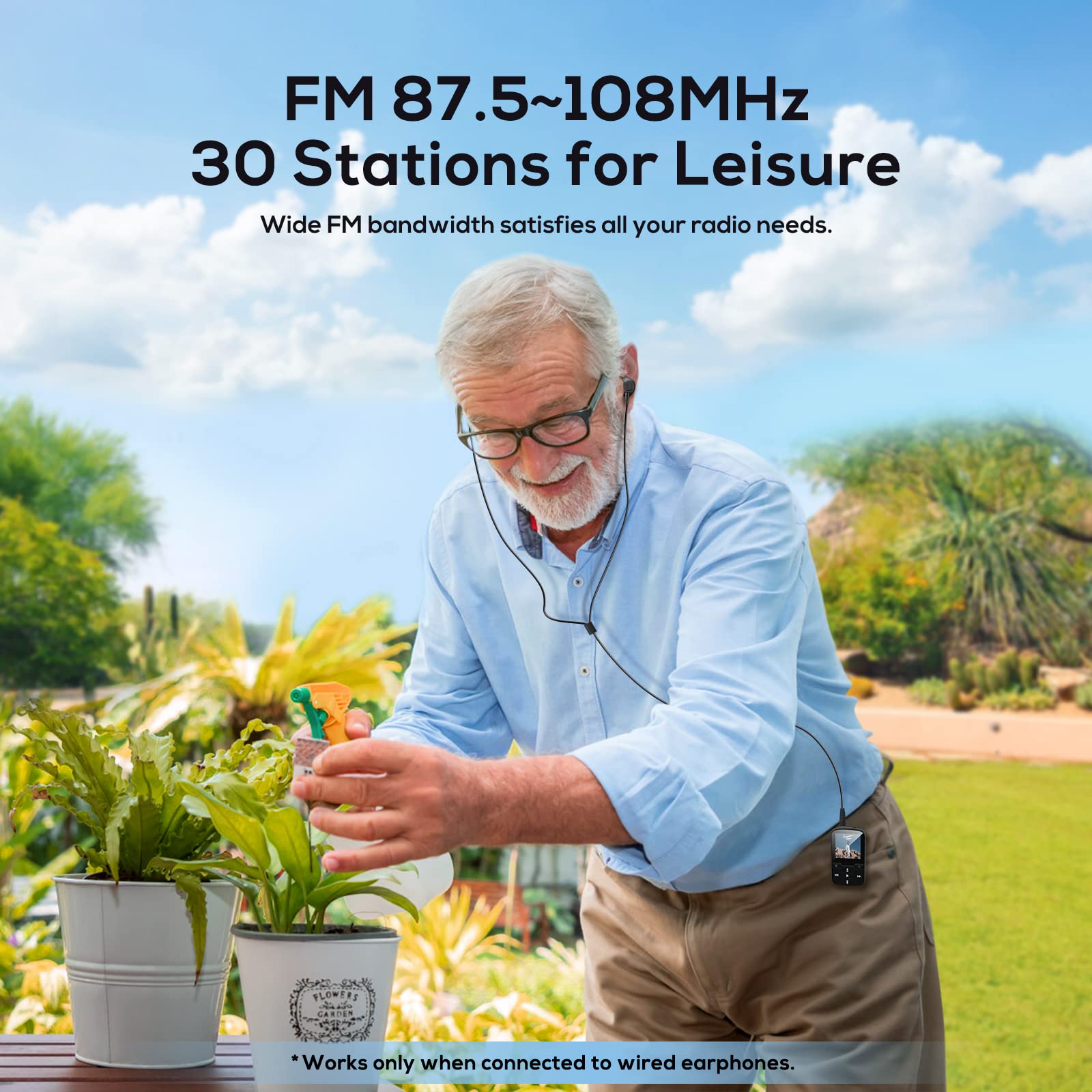 ["🎧WIRELESS OR WIRED MUSIC ON THE GO- Powered by Bluetooth 5.3, this mp3 player provides a stable connection with your wireless in-ear headphones, speakers, or wireless bluetooth headphones. It also has a 3.5mm jack for your wired headphones (less than 32 Ω). The device comes with a pair of wired headphones as a gift","🏃🏻🏃🏻♀️YOUR SMALL SPORTS MUSIC PLAYER- With its special clip design, this MP3 player can easily be attached to your clothing, and you won't feel heavy or bulky as it only weighs 27.5g. With the pedometer function, you can track your performance, perfect for outdoor running, treadmill at the gym, bodybuilding, sports, fitness, running, traveling, etc","🎶BLUETOOTH WIRELESS MP3 PLAYER 5.3 HiFi- Bluetooth 5.3 means faster transmission speed, stable performance, and high noise cancellation. This MP3 player features an intelligent chip that ensures high-quality sound in HIFI and supports formats such as APE/FLAC/WAV/WMA/MP3, as well as other lossless formats","🎵AND HIGH-CAPACITY STORAGE SCREEN- 1.5-inch color display for visual comfort. User interface design, easy to operate. With a built-in 16GB capacity, you can listen to music with up to 4,000 songs or store over 4,000 e-books, meeting most music needs. For those who need more storage space, the TF card slot supports up to a 128GB TF card (not included). The included charging cable can also be used as a data transfer cable","💝MULTIFUNCTIONAL DESIGN- This Mp3 player not only plays music but also supports FM radio for when you're relaxing or working in the garden; an e-book for bedtime reading; voice recording, and can function as a file storage. Ideal gift for parents and children. We also offer a lifetime warranty and friendly customer service 24/7. If you have any questions, please contact us and we will provide a satisfactory response (The MP3 and the box and the manual have our after-sales email address on them;)"]