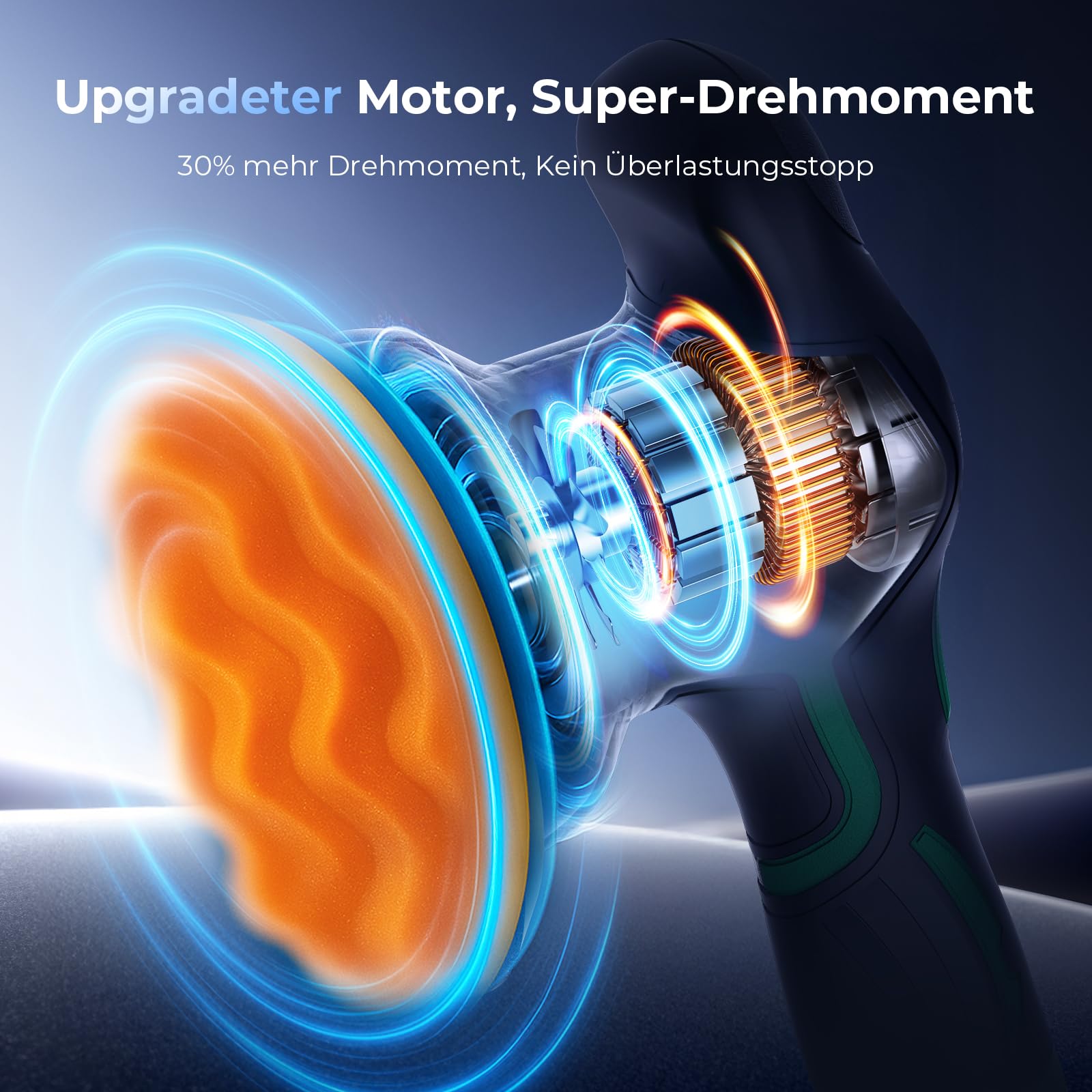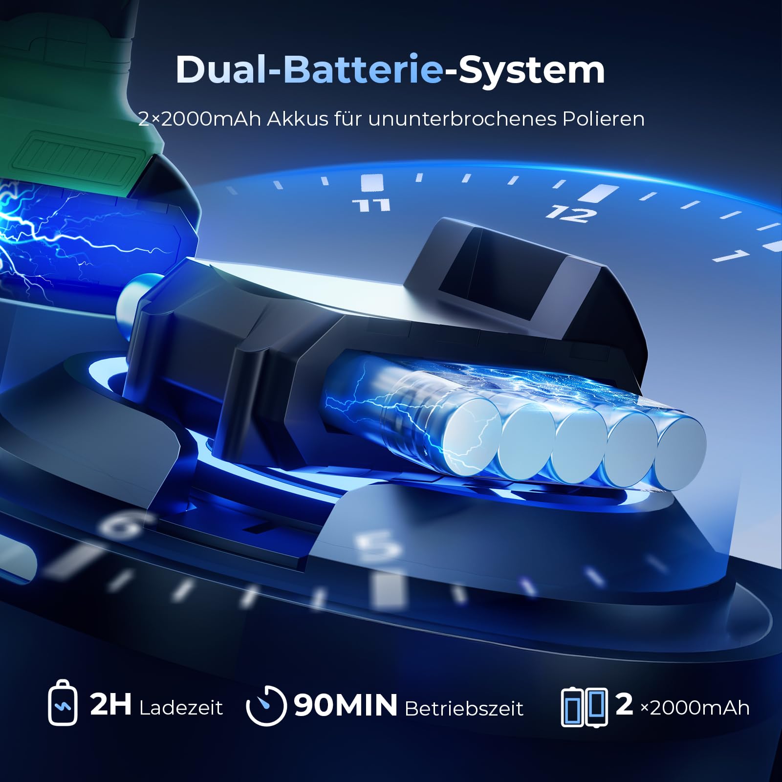 ["High-quality battery-powered polishing machine】 Say goodbye to cheap products - our professional battery-powered polishing machine set makes car care effortless: lightweight for one-handed operation, powerful motor with stable speed for perfect paint protection, durable battery for lasting performance.","【Intelligent Dual Battery System】 High-quality industrial batteries with 2x 2000mAh Li-Ion, 30-60 minutes runtime per battery. The innovative battery-powered polishing machine offers hot-swap function for uninterrupted polishing, completely cordless for maximum freedom.","【LCD display of the battery-powered polishing machine】 Real-time monitoring of all important parameters. The 8-speed control (2800-5500 RPM) makes this polishing machine the ideal partner for car care: Levels 1-4 for wax, levels 5-8 for professional polishes.","【9mm eccentricity】 Particularly user-friendly thanks to soft start function. The copper core motor of this battery-powered polishing machine delivers constant 2800-5500 RPM at 18V rated voltage (21V max) - ideal for all car care applications.","【22-piece professional set】 Includes: 2 batteries, 6 foam polishing discs (15cm), 2 wool discs, 4 polishing cloths, 3 sandpapers, 2 microfiber cloths, apron and storage bag.","【Premium quality - service guarantee】 Our polishing machine impresses with premium quality. The housing made of aerospace materials (PP+TPE composite) and certified components such as German motor and EU-compliant batteries offer highest reliability. As an Amazon-certified seller, we offer 24 months warranty and personal customer service. Important note: The machine has a non-removable 150mm base plate for optimal work stability. Please do not forcibly remove this. ✅ For technical questions, contact our customer service team (24-hour response guarantee)."]