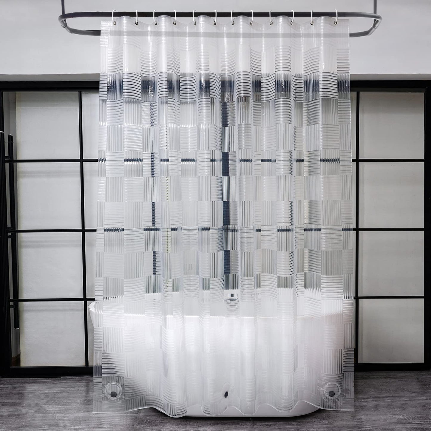 EurCross 3 stronger magnets transparent shower curtain 180x180 for bathroom, waterproof anti-mildew curtain with geometric 3D pattern, Eva plastic with 12 hooks