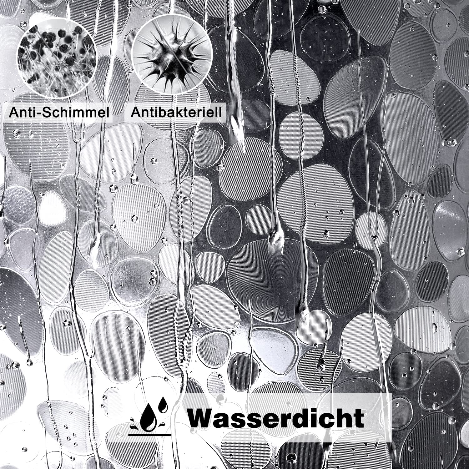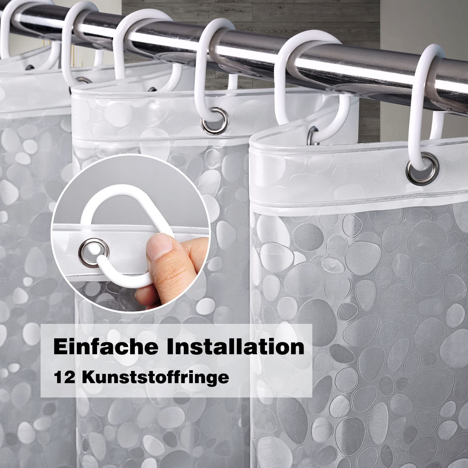 "Magnetic weights and metal eyelets: Three magnets on the bottom of the shower curtain liner can hold the curtain in place without sticking to or tying on you. The rustproof metal eyelets on the top prevent the curtain from tearing and damaging.","Material: EurCross semi-transparent 3D pebbles shower curtain 72 x 78 inches made of 100% EVA material, PVC and BPA free. High-quality EVA material provides an anti-mold and anti-bacterial effect, effectively preventing the growth of mold and bacteria. The semi-transparent 3D pebbles pattern protects your privacy well.","Waterproof: The shower curtain 72 x 78 inches is made of 100% EVA, which has good hydrophobicity. The smooth surface of the transparent shower curtain allows water drops to bead off easily, making the shower curtain waterproof.","Easy Installation: The shower curtain is 72x78 inches in size and features 12 rustproof metal eyelets on the top of the curtain and 12 plastic rings, allowing you to easily install your transparent shower curtain. It is perfect for straight or curved shower rods. The shower curtain 72x78 inches can easily cover the bathtub. very convenient and durable. It is very suitable for family and hotel.","Easy to clean: This Shower Curtain 72x78 inches is easy to clean, simply wipe the surface with a soft cloth or sponge and open the window after bathing."