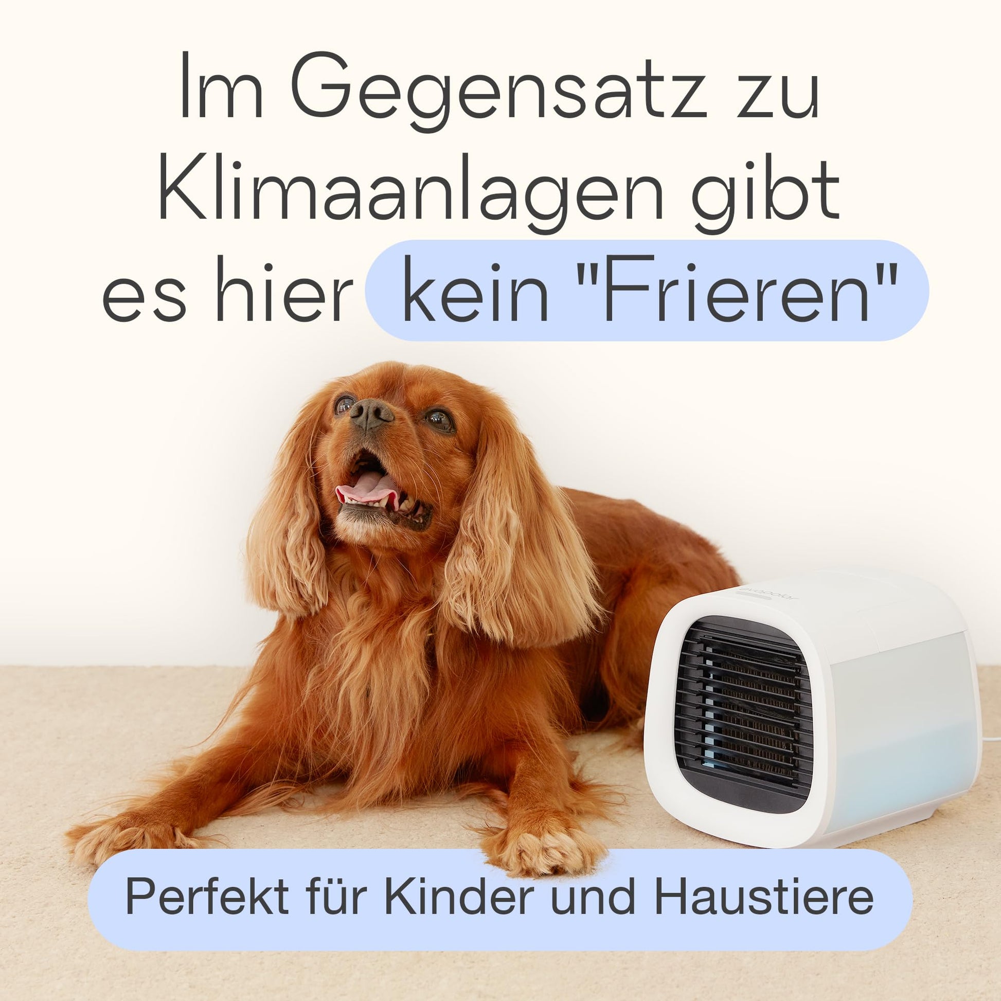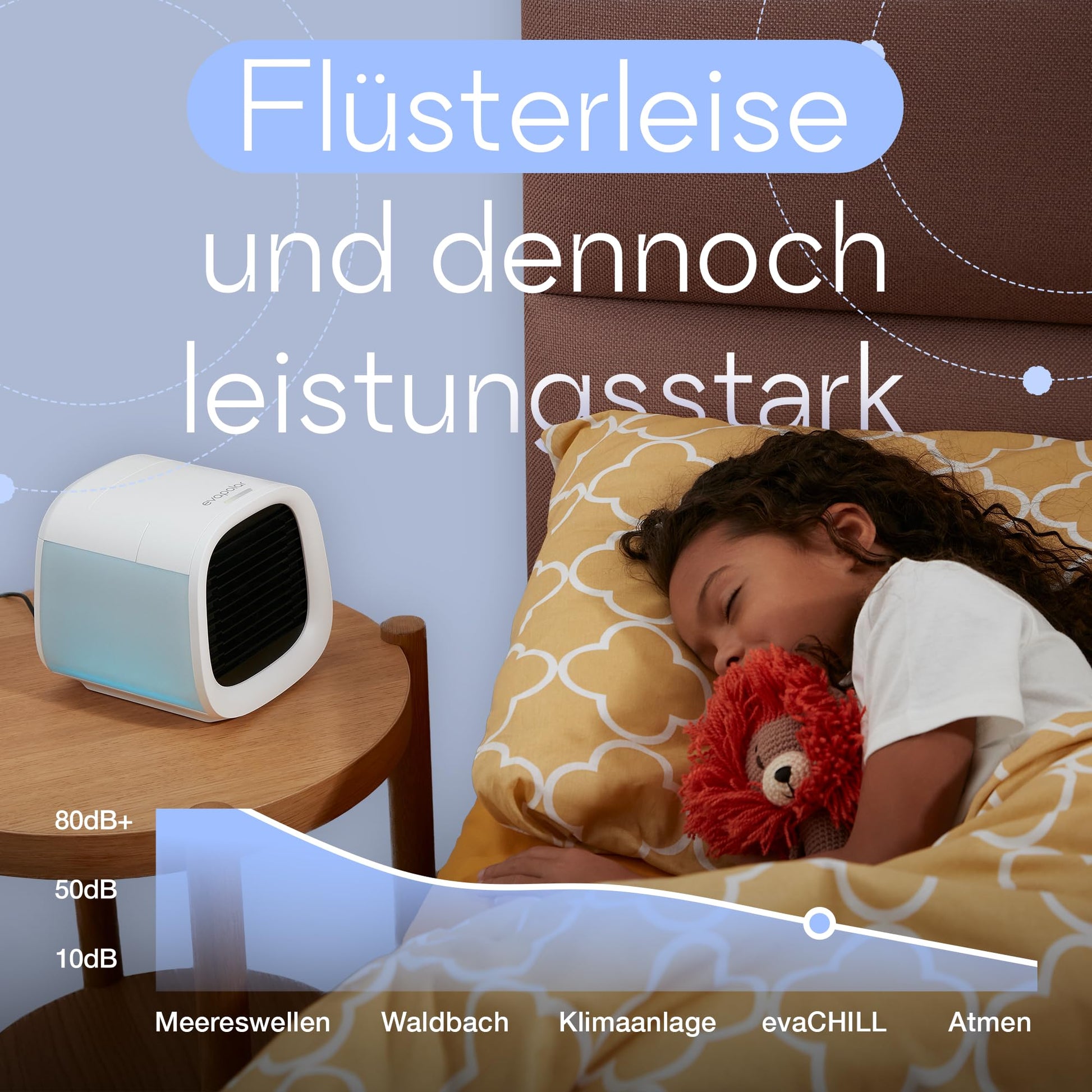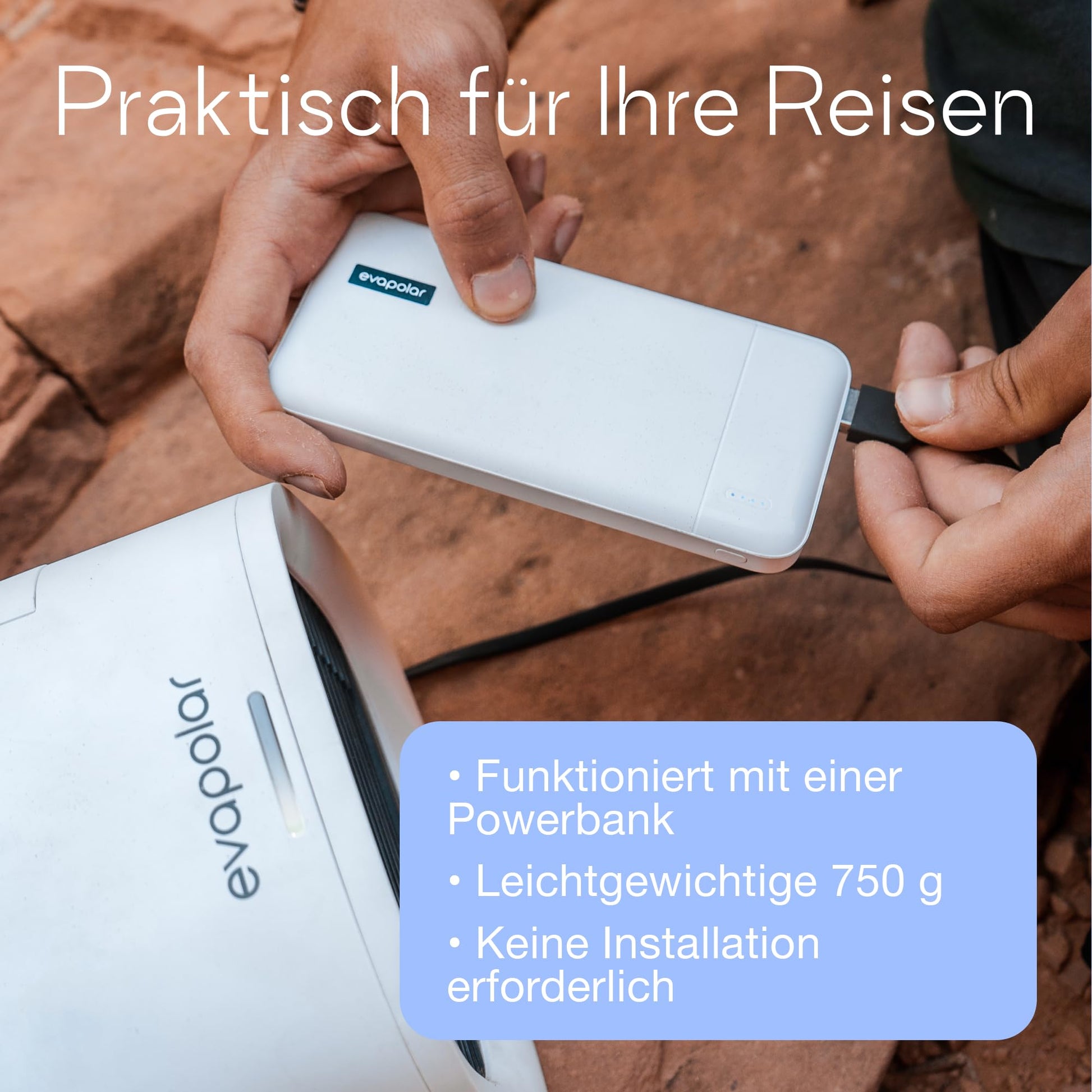 "Portable: The EvaCHILL cooling fan is portable and quiet (up to 50 dB), can be powered via USB from power banks, laptops, and a car socket with a capacity of at least 2 A 5 V. No installation required, so you can easily move around whether you're traveling, camping, working, studying, or just relaxing at home"