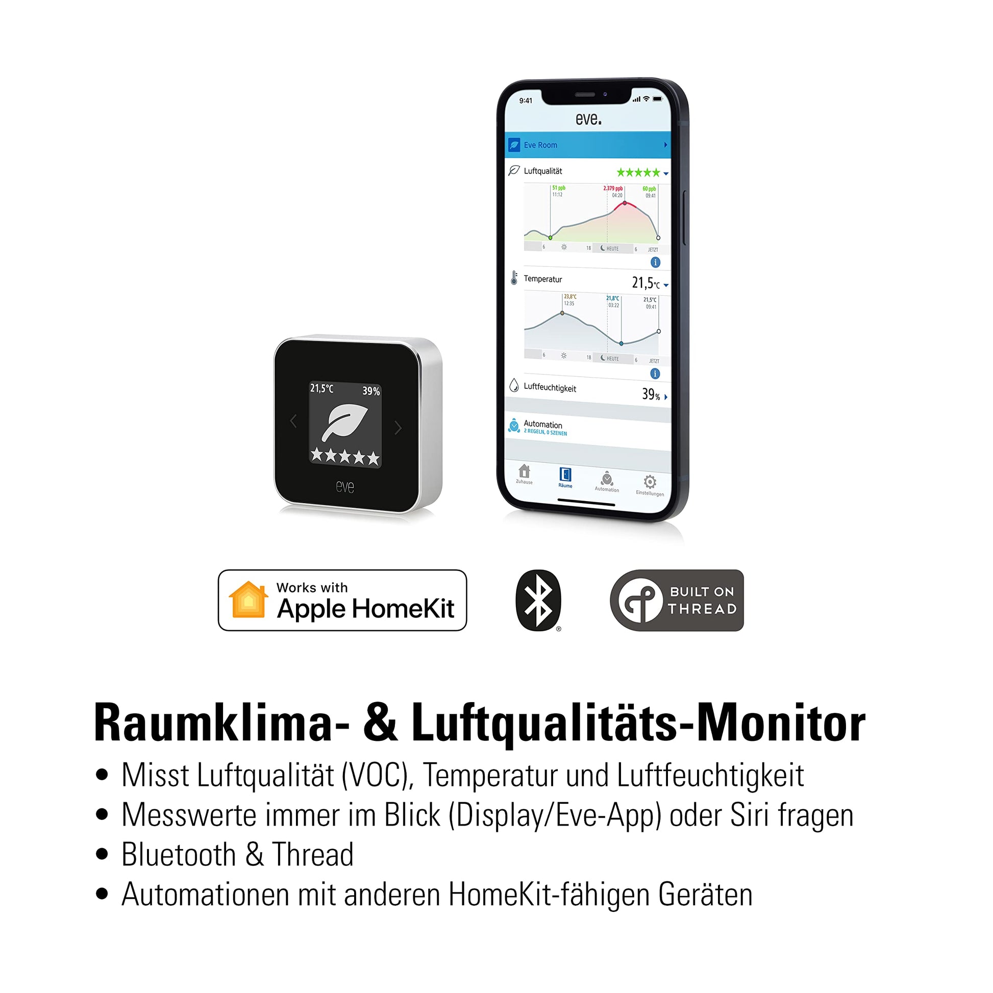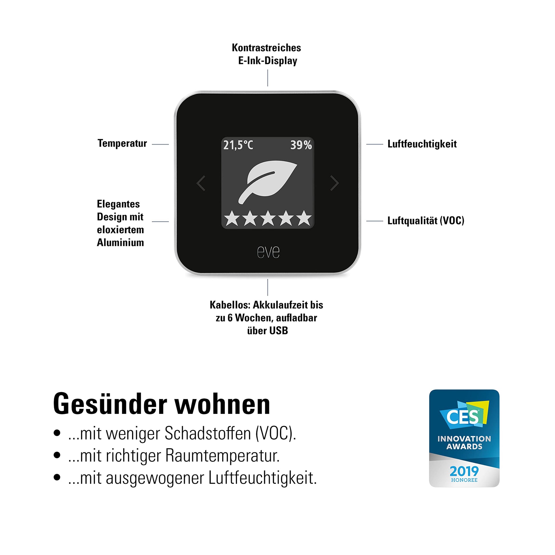 ["Eve Room requires an iPhone or iPad with the latest version of iOS/iPadOS","The key to healthy living: Eve Room measures pollutant concentration (VOC), temperature, and humidity in your home.","Detect harmful VOC concentrations from everyday items such as furniture, appliances, toys, and monitor how air quality decreases with activities like cooking and cleaning. This allows you to ventilate in time.","View the measurements on the high-contrast E-Ink display or on your iPhone and develop healthy behaviors based on the measurement history in the Eve app. Thanks to the integrated battery, Eve Room can be placed anywhere wirelessly (6 weeks battery life, rechargeable via USB).","HomeKit technology: Unprecedented ease of use and high security; Easy, fast installation and setup without a bridge or gateway; Automatically integrates into a Thread network (supports Bluetooth and Thread)."]
