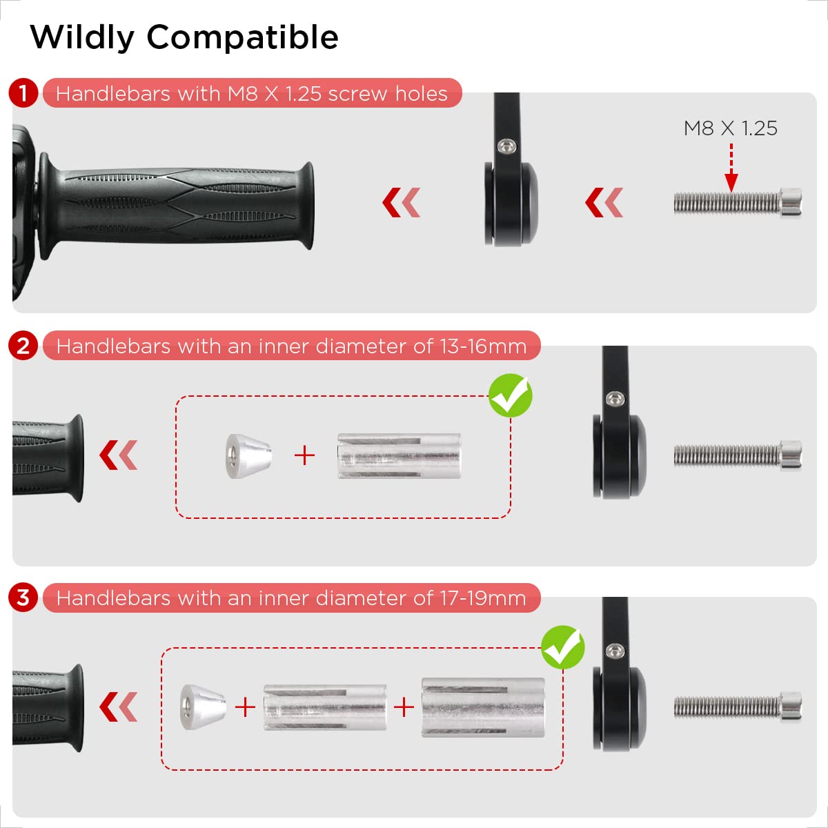 "【Compatibility】Handlebar end mirrors suitable for practically all handlebars with a 22mm (7/8" inch) outside diameter at the grips and a handlebar inner diameter of 13-16mm and 17-19mm. Note: an inner diameter of the grip between 16-17mm is not suitable for this rearview mirror. Before buying, please measure the exact inner width of the handlebar.