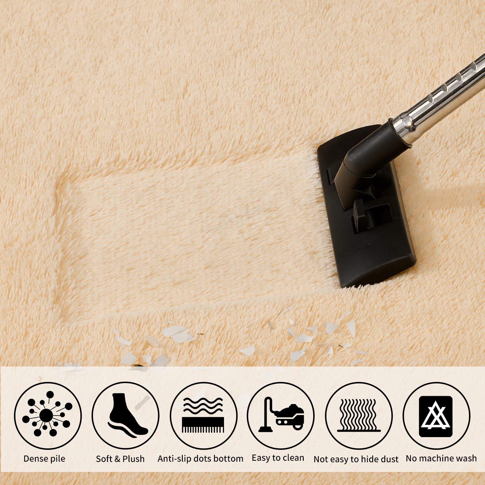 "Easy to Clean: Use a low-power handheld vacuum for adsorption and maintenance, which can quickly clean the dust on the surface of the high-pile rug. You can also clean or wipe the rug manually. After washing, place the rug in a cool place for ventilation, and please do not use a dehydrator for drying."