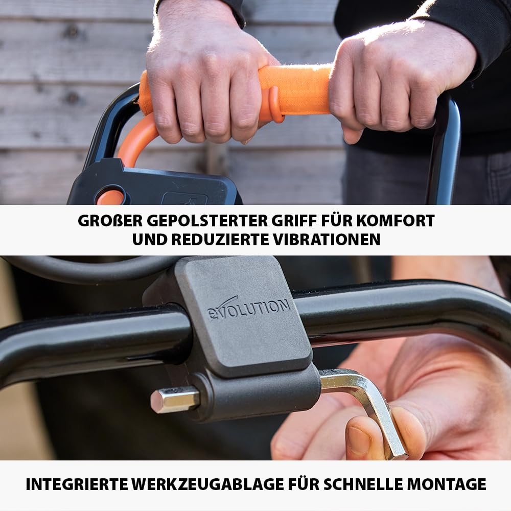["ELECTRIC COMPACTOR - This vibrating plate has a powerful 130W induction motor delivering a compaction force of 5Kn - no petrol or exhaust fumes, perfect for indoor use", "GET ALL BASE WORK DONE - Ideal for all types of surface preparation and landscaping, from leveling paving to patio, blockwork, compaction of sand or soil, and more", "3-YEAR WARRANTY INCLUDED - The H320-E vibrating plate comes with Evolution's best-in-class 3-year warranty", "COMPACT & PORTABLE - Ideal for DIY tasks like laying artificial grass and paving stones", "DUAL ROLL-BARS - Provide increased strength and protection during transport and ensure easy handling when carrying", "LOW MAINTENANCE - This vibration plate requires no petrol or oil, has fewer moving parts, weighs less than a petrol wacker, and emits no exhaust fumes", "IMPROVED USER COMFORT - Revised trigger control, thick padded handle, and vibration damping system for increased user comfort"]
