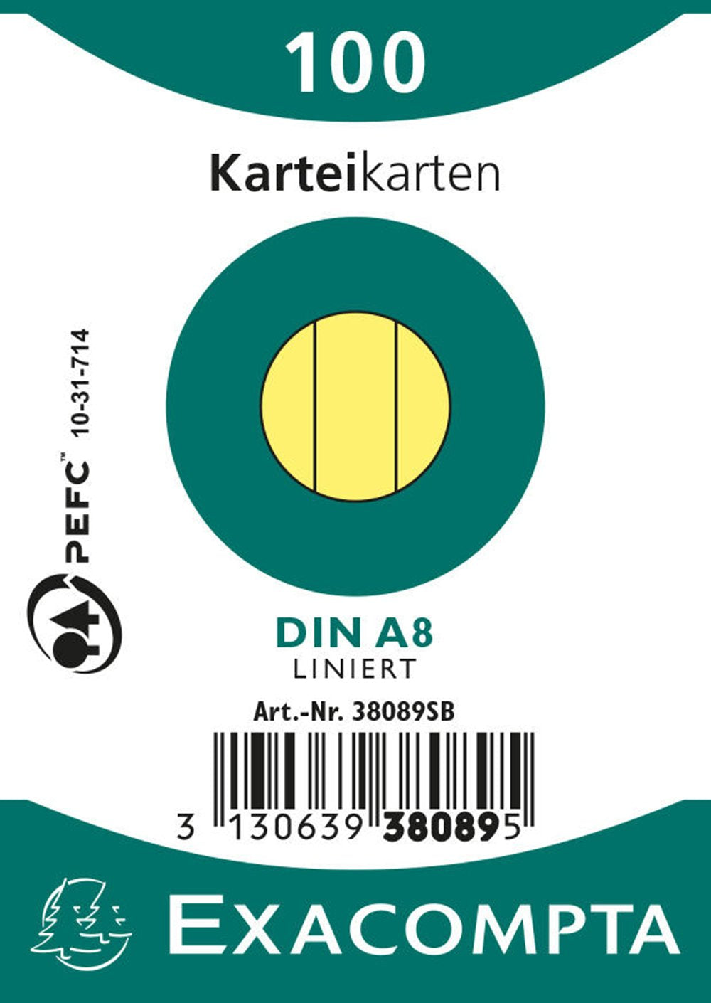 ["48 packs of 100 index cards per pack from Exacompta. The index cards are shrink-wrapped in packs. Made of calibrated cardboard, 205 g. Packed in 100 pieces. lined DIN A8 100 pcs shrink-wrapped yellow","Top quality at a consistently high level. Made from pulp sourced from sustainably managed forests. 100% PEFC certified and pH-neutral dyed","Ideal for school or your notes","Size: DIN A8, 5.2 x 7.4 cm. Ruled lining","Contents: 48 packs of 100 sheets per pack. Color: yellow"]