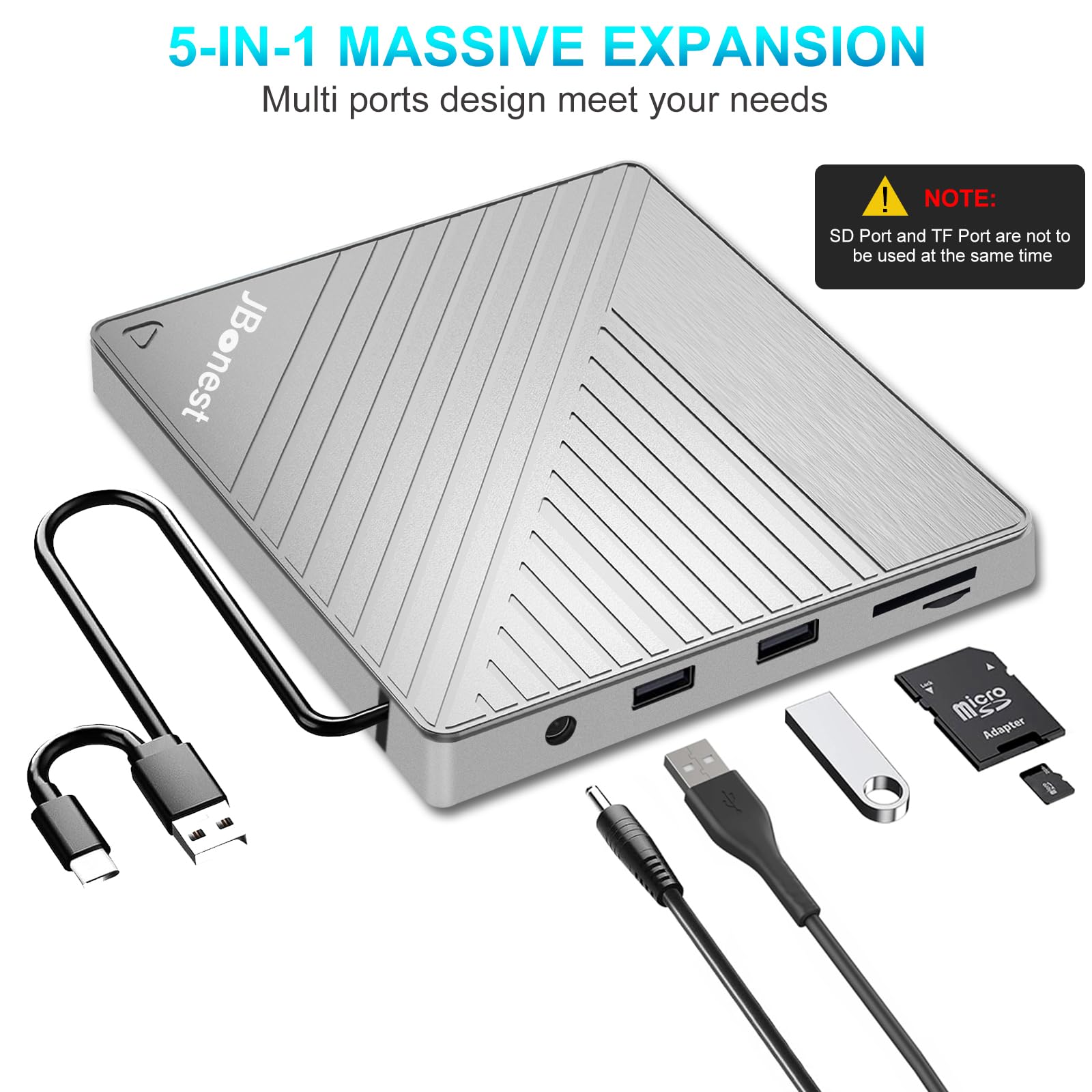 ["【Plug & Play】 Easy to use, Make Your Life Easier. The external DVD drive does not require any additional drivers. Simply connect the external DVD drive directly to your PC's USB or Type C port. The DVD driver will be recognized and your happy journey begins. It gives you a faster and smoother experience when watching movies or installing software. Make sure your Windows Media Player supports the displayed media formats.","【High Speed】CD-ROM drive with advanced burning technology, supports CD-R, CD-RW, DVD-R, DVD-RW. Max DVD-ROM read speed 8X; Max CD-ROM read speed 24X and maximum DVD burning speed 8X; Max CD burning speed 24X. External CD drive features two USB ports, 1 micro USB port, 1 SD slot, and 1 TF slot. PS: SD slot and TF slot cannot be used simultaneously. Micro USB port is for charging only.","【Wide Compatibility】The external USB CD drive is compatible with Windows XP / 7 / 8 / 10 / 11, VISTA, Mac OS 8.6 or higher and is a perfect addition for APPLE / DELL / SONY / SAMSUNG / ASUS / ACER / HP, notebooks, ultrabooks, PCs, desktops, and other brands without internal drive (not compatible with Windows98!). External CD / DVD drive - Works with USB 3.0 high speed interface, providing faster data transfer speed (up to a maximum of 5 Gbps).","【Stylish Design】The device is embedded with a unique burn-proof control chip. While recording, it can effectively prevent the disc from breaking and provide extremely strong error correction function when reading the disc. With the integrated cable in the CD drive, the drive can be easily stored in a bag or drawer.","【Ultra Thin & Portable】This external CD ROM drive is portable and lightweight, the built-in data cable is easy to use and organize, and the anti-slip rubber pad prevents it from sliding on the desk, allowing you to easily use it. Plug it into your computer's laptop bag and take it home, to the office, or anywhere. It is a great gift for fans who collect CDs and DVDs. Enjoy your life.","Note: TVs, tablets, Blu-ray discs, 3D, 4K, 2K DVD, cars, smartphones, projectors, PS 5, Xbox, Switch, Chrome OS are not supported."]