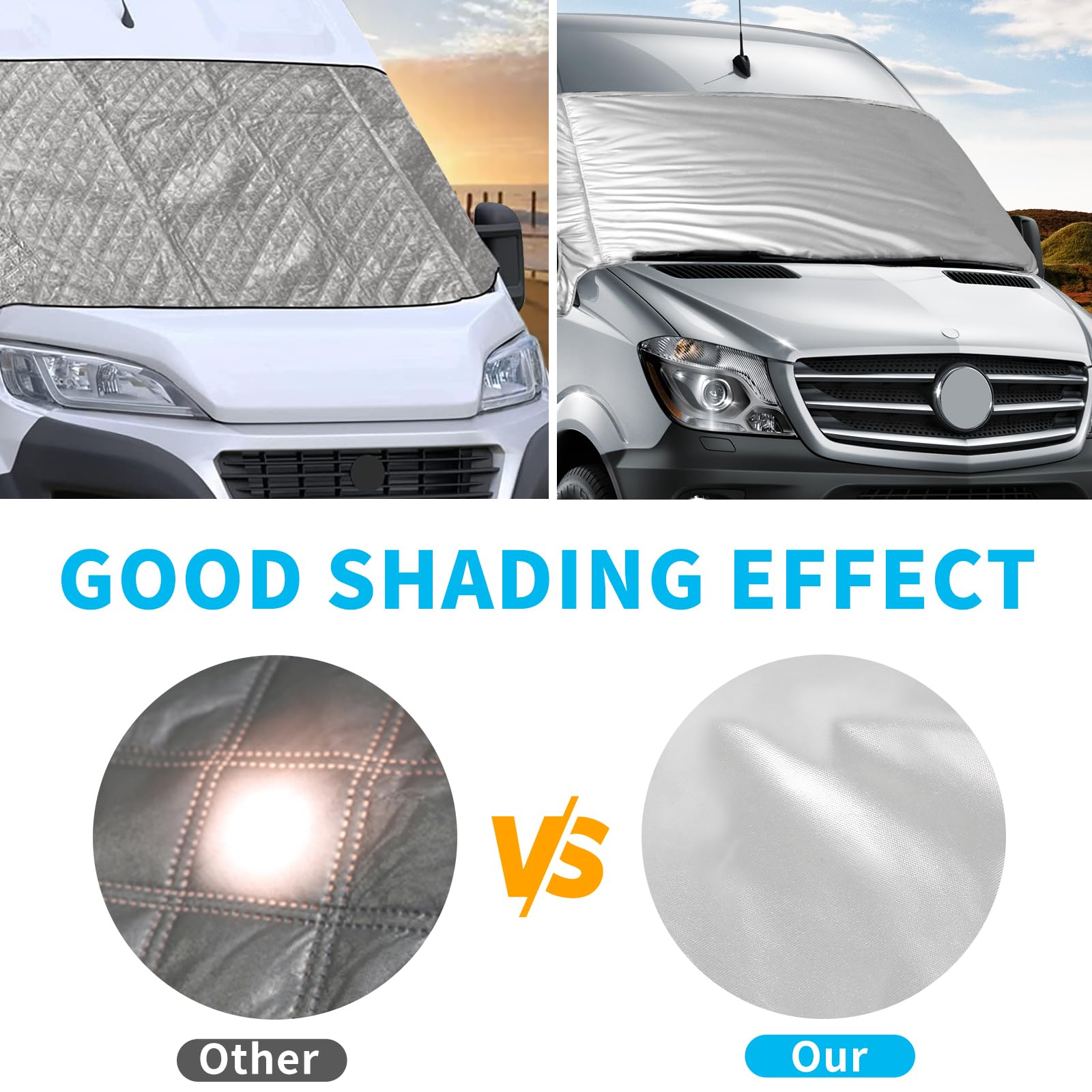 "Compatibility: Fits for Mercedes Sprinter 2019-2024. High Quality: Interior made of 210D Oxford Cloth, middle layer of cotton, and exterior of reflective silver aluminum film-coated cotton, the external thermal windshield cover is durable, waterproof, can provide superior protection. Protect Privacy: Reflective silver color with opacity for maximum privacy allows you to do anything in the car without worry. Year-Round Protection: Protects your car windshield in winter from ice and frost, keeps cool in summer with sun protection. Protects your car from dust, UV rays, and corrosion in daily life. Easy to Use: With side Velcro closure and door clips design, the front windshield wrap cover fits securely on your car without slipping or bubbling."