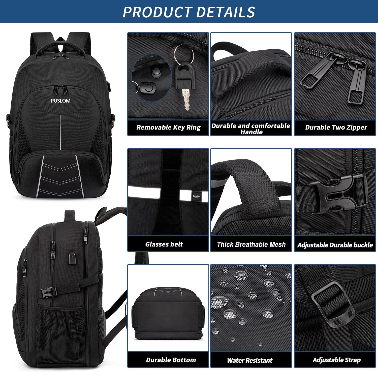 "LOTS OF STORAGE AND ORGANIZED - Super Big Backpack for Men has more than 20 independent pockets for ample storage. 3 main compartments, 1 separate padded laptop compartment, 1 front zippered pocket. Both side mesh pockets outside for oversized water bottle and umbrella, three mesh pockets to fit your laptop accessories, school supplies. 9 interior pockets for keys, pen or small items. With lanyard design on the shoulder strap, easily hang sunglasses.