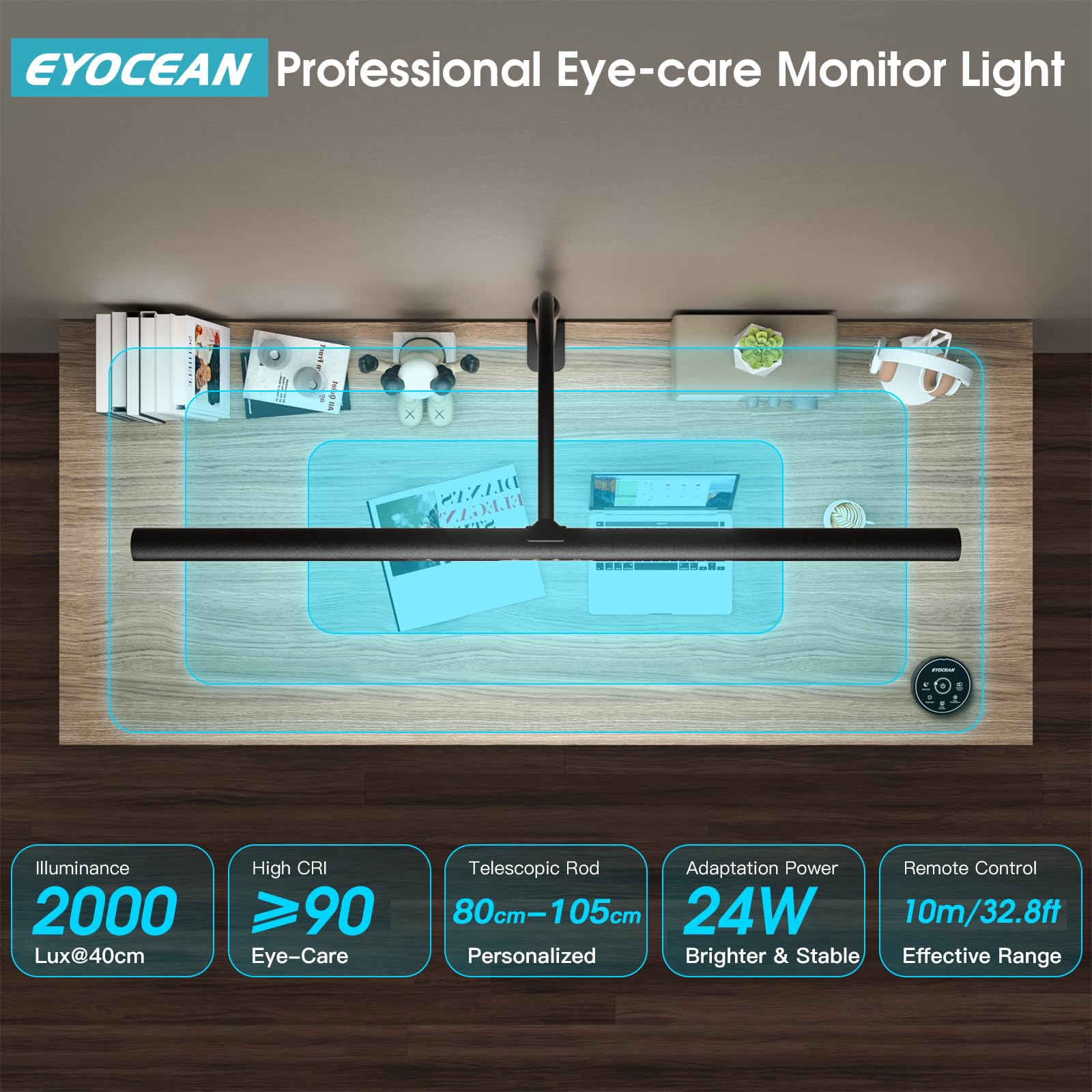 ["Remote Control & Gesture Control】This LED lamp is equipped with wireless remote control and gesture control function, allowing you to control the lamp more conveniently. Thanks to the height-adjustable telescopic rod, it is ideal for large monitors or multiple monitor scenarios. To provide you with a good lighting environment for work, study, programming, video editing, video conferences, etc.","【Asymmetrical Optical Design】Our LED desk lamp features an asymmetrical optical design, eliminating screen reflections, no blue light, no glare, and the soft light source protects your eyes from fatigue. The memory function remembers your last settings, no reset required. It also has a 10/40 minute timer function","【80 cm Ultra-wide Hidden Light Source】Built-in 160 eye-friendly LED chips (80 cold white, 80 warm white); 5 color temperatures × 5 brightness levels can achieve a variety of light combination modes. It also has four preset modes to meet your different lighting requirements. Our lamp head is made of high-quality aluminum alloy with good heat conduction, long service life","【Adjustable Swan Neck & Telescopic Rod】The high and stable telescopic rod (Adjustable Height: 80 cm–105 cm) made of metal combined with the flexible swan neck offers you flexible height adjustment and multiple lighting angles. The strong metal clamp supports a table top of up to 6.8 cm and saves valuable space on your desk","【WHAT YOU GET】Three years worry-free warranty. 1x Desk lamp (Material: high-quality aviation aluminum alloy, matte black finish); 1x Remote control; 1x GS Adapter (Length: 180 cm / 71 in); 1x User manual. Please feel free to contact us if you have any questions"]