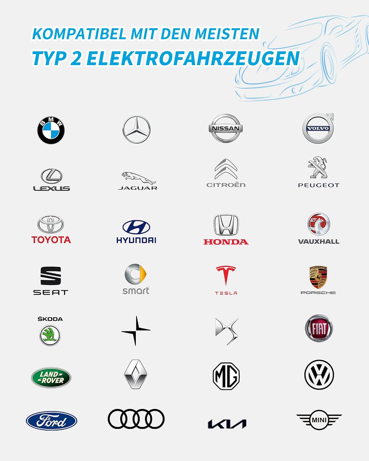 "Comprehensive compatibility: This Type 2 charging cable extension is specifically designed for various electric and hybrid models in Europe, ensuring compatibility with all vehicles using the Type 2 charging standard.",