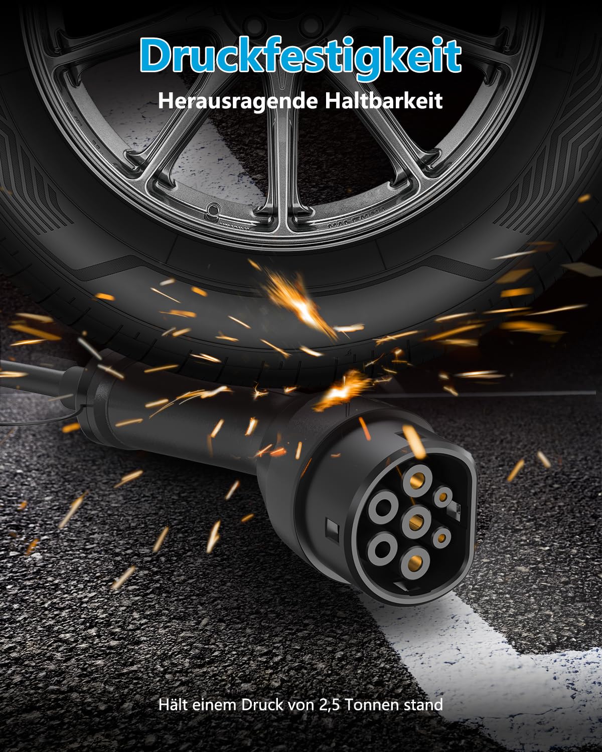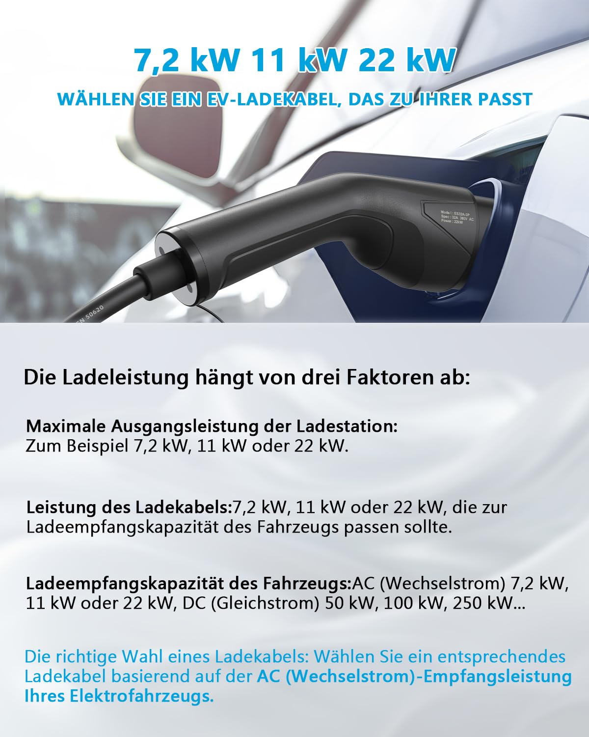 ["Fast portable charging: The E car charging cable Type 2 offers three power options (7.2 kW, 11 kW, 22 kW). Choose the Type 2 charging cable that matches your electric vehicle's power to ensure a fast and efficient charging experience. Reduce wait times and extend time on the road.",