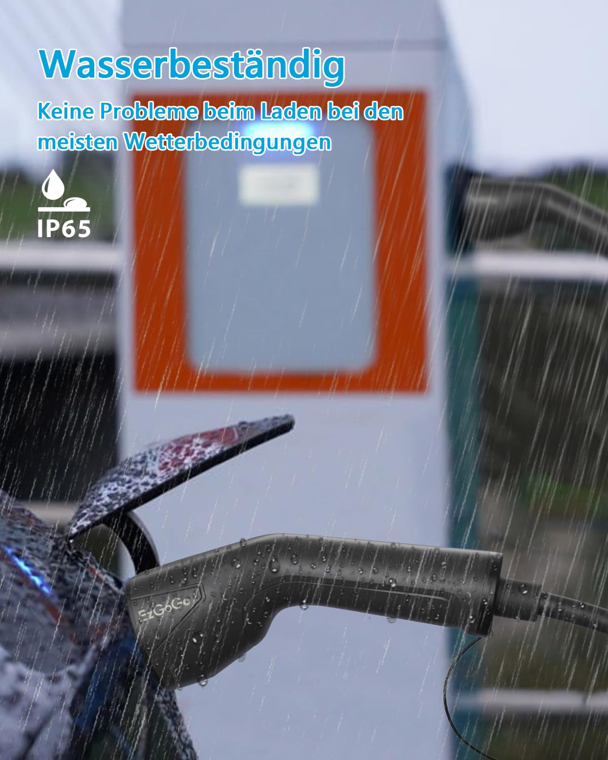 "Comprehensive safety guarantee: The Type 2 charging cable has CE and RoHS safety certification, a TUV-certified cable standard, and IP65 water and dust resistance, allowing for worry-free charging. With lightning protection, you can safely charge your vehicle in any weather.",