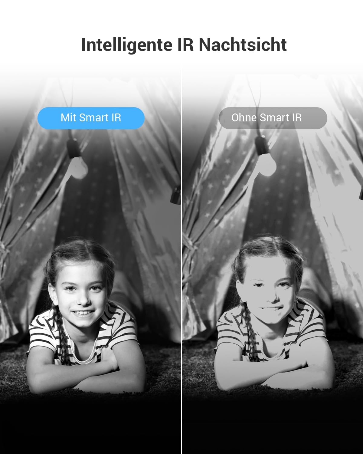 ["1080P FHD & intelligent night vision: In 2MP you see all the details. Thanks to the new Smart IR technology, the infrared LEDs automatically adjust to the environment, preventing overexposure in night vision mode", "360° coverage with motion tracking: Thanks to the wide-angle lens, this indoor camera monitors every corner. Intelligently, the WiFi IP camera automatically moves for precise motion tracking", "Real-time alarm: As soon as the motion detector is triggered, you will be notified immediately of when, where, and what movements the security camera detects", "Two-way audio: The built-in microphone and speaker of this baby camera allow you to speak with your loved ones and deter unwanted intruders", "Compatible with Alexa: You can conveniently control the camera with your voice through the Alexa Smart device. It is also compatible with other Smart Home systems like Google Home"]