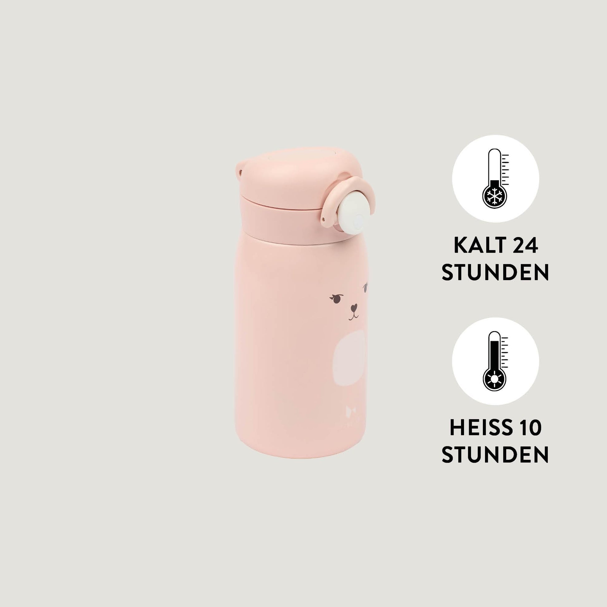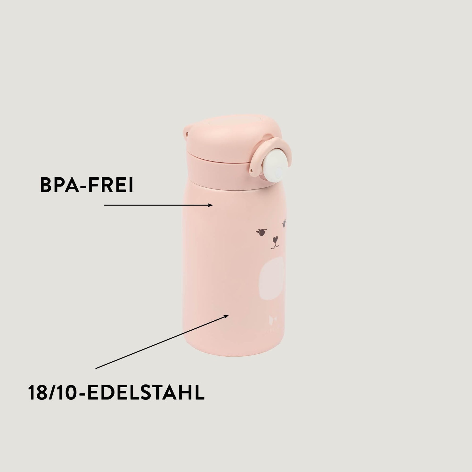 "Perfect for on the go or school, easy to open and secure to drink for kids. The special design prevents accidental opening in the backpack and makes it ideal for small hands. The bottle features a drinking spout for safe and convenient drinking. It fits effortlessly in the side pockets of our new Large Backpack, making it always within reach. With a capacity of 10.8 oz, it is perfectly sized for daily use. Sturdy in design, it offers an eco-friendly alternative to disposable bottles and is an investment in our children's future. Keeps drinks cold for 24 hours and hot for 10 hours without imparting flavor. Made of high-quality 18/10 stainless steel and with a BPA-free PP plastic lid and silicone seal for maximum safety. Not dishwasher safe, so please do not put it in the dishwasher. This could affect the thermal effect. Hand washing is recommended to maintain the quality and performance of the bottle."