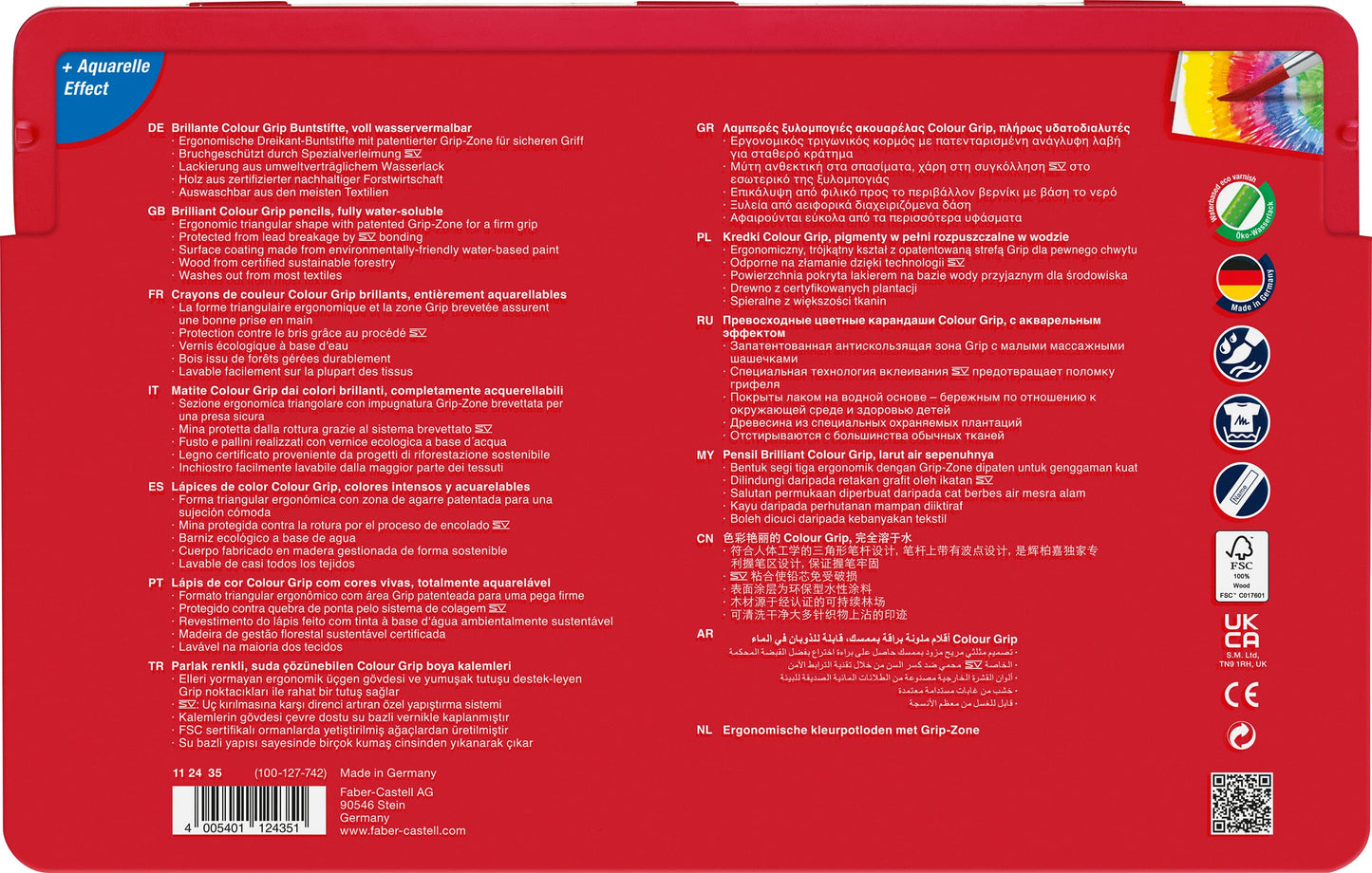 ["Color Grip set with 36 colored pencils in metal case","The triangular shape promotes the three-finger grip","With patented Soft-Grip Zone","Break-resistant lead due to special bonding","Suitable for right and left-handed individuals"]