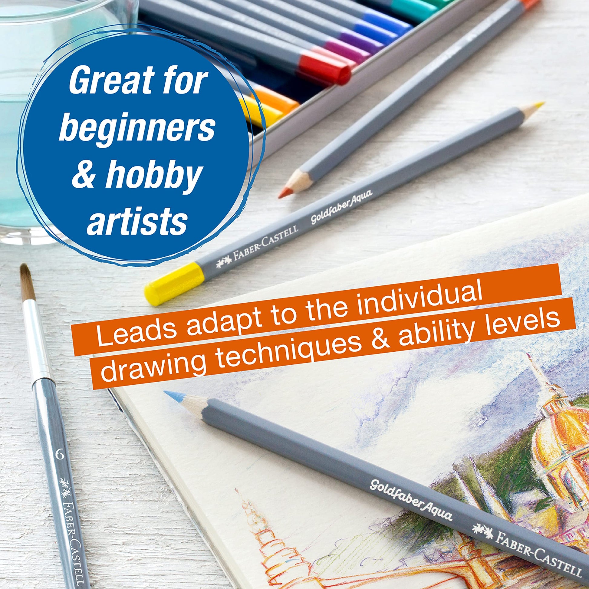["Metal case with 48 Goldfaber Aqua pencils", "Colored pencil with highly pigmented 3.3 mm lead for quick sketches, hatching, or evenly shaded areas", "Color completely blendable with water", "High break-resistance and easy sharpening with all standard sharpeners", "Excellent lightfastness and soft, rich stroke for vibrant and lively colors"]